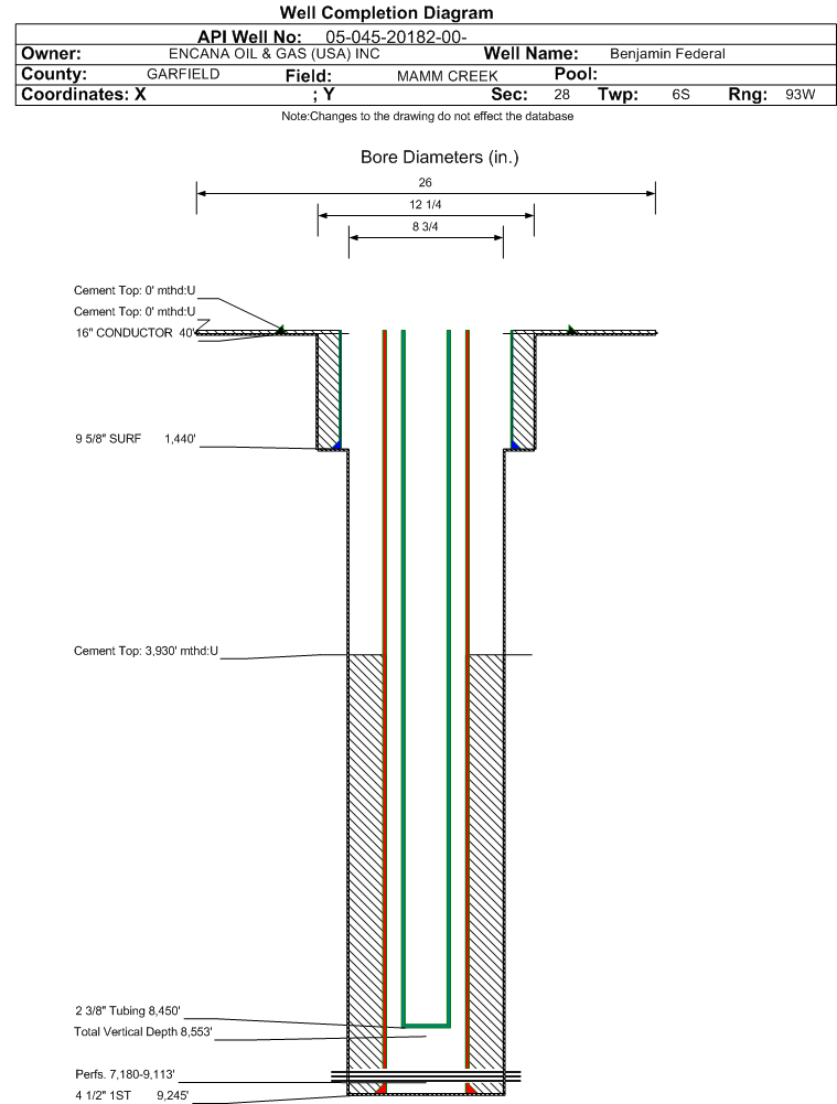 | Wellbore Completed | | Completion Date: | 3/26/2011 | | Spud Date: | 1/24/2011 | Spud Date Is: | ACTUAL | | Measured TD: | 9255 ft. | Measured PB depth: | 9180 ft. | | True Vertical TD: | 8553 ft. | True Vertical PB depth: | 8478 ft. | | Top PZ Location: | Sec:33 Twp: 6S 93W | Footage: 344 FNL 313 FWL | | Bottom Hole Location: | Sec:33 Twp: 6S 93W | Footage: 362 FNL 291 FWL | | Log Types: | RST, CBL (same log) and Mud. | | Casing: | String Type: CONDUCTOR, Hole Size: , Size: , Top: 0 ft., Depth: 40 ft., Weight: 42 , Citings Type: ACTUAL | | Cement: | Sacks: 40, Top: 0 ft., Bottom: 40 ft., Determination Method: VISU | | Casing: | String Type: SURF, Hole Size: 12.25 in., Size: 9.625 in., Top: 0 ft., Depth: 1440 ft., Weight: 36 , Citings Type: ACTUAL | | Cement: | Sacks: 463, Top: 0 ft., Bottom: 1440 ft., Determination Method: VISU | | Casing: | String Type: 1ST, Hole Size: 8.75 in., Size: 4.5 in., Top: 0 ft., Depth: 9245 ft., Weight: 12 , Citings Type: ACTUAL | | Cement: | Sacks: 1651, Top: 3930 ft., Bottom: 9245 ft., Determination Method: CBL | | Formation | Interval Top | Log Bottom | Cored | DSTs | | WILLIAMS FORK | 5345 ft. | 9255 ft. | N | N |