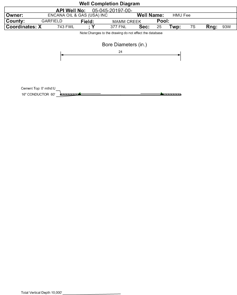 | Wellbore Completed | | Completion Date: | N/A | | Measured TD: | | Measured PB depth: | | | True Vertical TD: | | True Vertical PB depth: | | | Casing: | String Type: CONDUCTOR, Hole Size: 24 in., Size: 16 in., Top: 0 ft., Depth: 60 ft., Weight: 0.25 , Citings Type: ACTUAL | | Cement: | Sacks: 100, Top: 0 ft., Bottom: 60 ft., Determination Method: | | No formation data to display. |