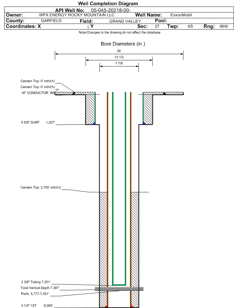Wellbore #00 Wellbore Classification: GW Status: PR - 10/31/2011 Measured TD: 8080 ft. Vertical TD: 7387 ft.| Wellbore Data for Original Wellbore | Wellbore Classification: GW PR - 10/31/2011 | | Wellbore Permit | DIRECTIONAL | | Permit #: | | Expiration Date: | 12/11/2012 | | Proposed Top PZ Location: | Sec:22 Twp: 6S 96W | Footage: 1536 FSL 874 FEL | | Bottom Hole Location: | Sec:22 Twp: 6S 96W | Footage: 1536 FSL 874 FEL | | Proposed Depth/Form: | 8064 ft. | | Surface Mineral Owner Same: | No | | Mineral Owner: | FEDERAL | Surface Owner: | FEE | | Unit: | | Unit Number: | | | Formation And Spacing: | Code: WMFK , Formation: WILLIAMS FORK , Order: 510-20 , Unit Acreage: , Drill Unit: Unspaced | | Casing: | String Type: CONDUCTOR, Hole Size: 24 in., Size: 1 in., Top: , Depth: 45 ft., Weight: 48# , Citings Type: PLANNED | | Cement: | Sacks: 25, Top: 0 ft., Bottom: 45 ft. | | Casing: | String Type: SURF, Hole Size: 13.5 in., Size: 9.625 in., Top: , Depth: 1203 ft., Weight: 32.3# , Citings Type: PLANNED | | Cement: | Sacks: 420, Top: 0 ft., Bottom: 1203 ft. | | Casing: | String Type: 1ST, Hole Size: 7.875 in., Size: 4.5 in., Top: , Depth: 8064 ft., Weight: 11.6# , Citings Type: PLANNED | | Cement: | Sacks: 559, Top: , Bottom: 8064 ft. |