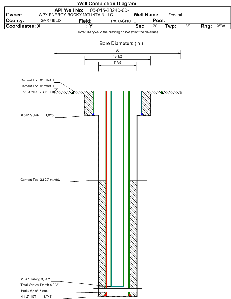 Wellbore #00 Wellbore Classification: GW Status: PR - 4/2/2012 Measured TD: 8765 ft. Vertical TD: 8323 ft.| Wellbore Data for Original Wellbore | Wellbore Classification: GW PR - 4/2/2012 | | Wellbore Permit | DIRECTIONAL | | Permit #: | | Expiration Date: | 12/11/2012 | | Proposed Top PZ Location: | Sec:20 Twp: 6S 95W | Footage: 902 FSL 1636 FWL | | Bottom Hole Location: | Sec:20 Twp: 6S 95W | Footage: 902 FSL 1636 FWL | | Proposed Depth/Form: | 8748 ft. | | Surface Mineral Owner Same: | Yes | | Mineral Owner: | FEDERAL | Surface Owner: | FEDERAL | | Unit: | | Unit Number: | | | Formation And Spacing: | Code: WMFK , Formation: WILLIAMS FORK , Order: 440-25 , Unit Acreage: 320, Drill Unit: S/2 | | Casing: | String Type: CONDUCTOR, Hole Size: 24 in., Size: 18 in., Top: , Depth: 45 ft., Weight: 48 , Citings Type: PLANNED | | Cement: | Sacks: 25, Top: 0 ft., Bottom: 45 ft. | | Casing: | String Type: SURF, Hole Size: 13.5 in., Size: 9.625 in., Top: , Depth: 875 ft., Weight: 32.3 , Citings Type: PLANNED | | Cement: | Sacks: 305, Top: 0 ft., Bottom: 875 ft. | | Casing: | String Type: 1ST, Hole Size: 7.875 in., Size: 4.5 in., Top: , Depth: 8748 ft., Weight: 11.6 , Citings Type: PLANNED | | Cement: | Sacks: 603, Top: 5040 ft., Bottom: 8748 ft. |