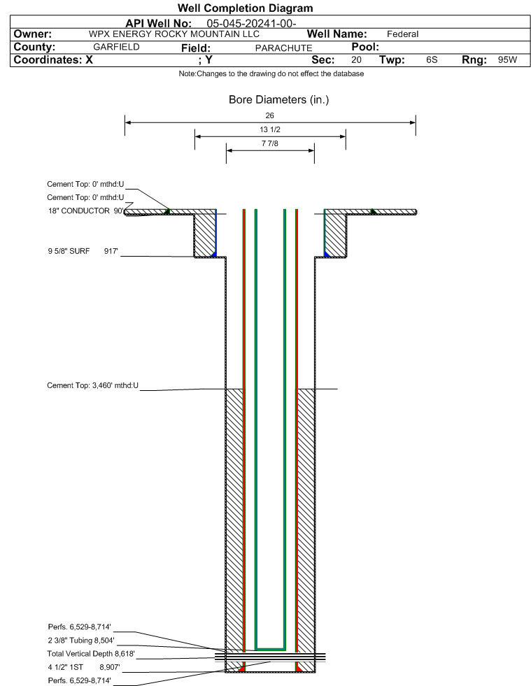 Wellbore #00 Wellbore Classification: GW Status: PR - 4/5/2012 Measured TD: 8919 ft. Vertical TD: 8618 ft.| Wellbore Data for Original Wellbore | Wellbore Classification: GW PR - 4/5/2012 | | Wellbore Permit | DIRECTIONAL | | Permit #: | | Expiration Date: | 12/11/2012 | | Proposed Top PZ Location: | Sec:20 Twp: 6S 95W | Footage: 2340 FSL 614 FEL | | Bottom Hole Location: | Sec:20 Twp: 6S 95W | Footage: 2340 FSL 614 FEL | | Proposed Depth/Form: | 9038 ft. | | Surface Mineral Owner Same: | Yes | | Mineral Owner: | FEDERAL | Surface Owner: | FEDERAL | | Unit: | | Unit Number: | | | Formation And Spacing: | Code: WMFK , Formation: WILLIAMS FORK , Order: 440-25 , Unit Acreage: 320, Drill Unit: s/2 | | Casing: | String Type: CONDUCTOR, Hole Size: 24 in., Size: 18 in., Top: , Depth: 45 ft., Weight: 48 , Citings Type: PLANNED | | Cement: | Sacks: 25, Top: 0 ft., Bottom: 45 ft. | | Casing: | String Type: SURF, Hole Size: 13.5 in., Size: 9.625 in., Top: , Depth: 904 ft., Weight: 32.3 , Citings Type: PLANNED | | Cement: | Sacks: 316, Top: 0 ft., Bottom: 904 ft. | | Casing: | String Type: 1ST, Hole Size: 7.875 in., Size: 4.5 in., Top: , Depth: 9038 ft., Weight: 11.6 , Citings Type: PLANNED | | Cement: | Sacks: 628, Top: 5181 ft., Bottom: 9038 ft. |