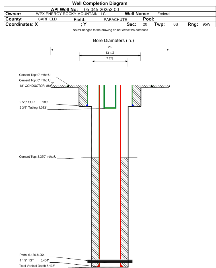 Wellbore #00 Wellbore Classification: GW Status: PR - 4/2/2012 Measured TD: 8450 ft. Vertical TD: 8436 ft.| Wellbore Data for Original Wellbore | Wellbore Classification: GW PR - 4/2/2012 | | Wellbore Permit | DIRECTIONAL | | Permit #: | | Expiration Date: | 12/11/2012 | | Proposed Top PZ Location: | Sec:20 Twp: 6S 95W | Footage: 583 FSL 2088 FEL | | Bottom Hole Location: | Sec:20 Twp: 6S 95W | Footage: 583 FSL 2088 FEL | | Proposed Depth/Form: | 8471 ft. | | Surface Mineral Owner Same: | Yes | | Mineral Owner: | FEDERAL | Surface Owner: | FEDERAL | | Unit: | | Unit Number: | | | Formation And Spacing: | Code: WMFK , Formation: WILLIAMS FORK , Order: 440-25 , Unit Acreage: 320, Drill Unit: S/2 | | Casing: | String Type: CONDUCTOR, Hole Size: 24 in., Size: 18 in., Top: , Depth: 45 ft., Weight: 48 , Citings Type: PLANNED | | Cement: | Sacks: 25, Top: 0 ft., Bottom: 45 ft. | | Casing: | String Type: SURF, Hole Size: 13.5 in., Size: 9.625 in., Top: , Depth: 1100 ft., Weight: 32.3 , Citings Type: PLANNED | | Cement: | Sacks: 384, Top: 0 ft., Bottom: 1100 ft. | | Casing: | String Type: 1ST, Hole Size: 7.875 in., Size: 4.5 in., Top: , Depth: 8471 ft., Weight: 11.6 , Citings Type: PLANNED | | Cement: | Sacks: 610, Top: 4724 ft., Bottom: 8471 ft. |