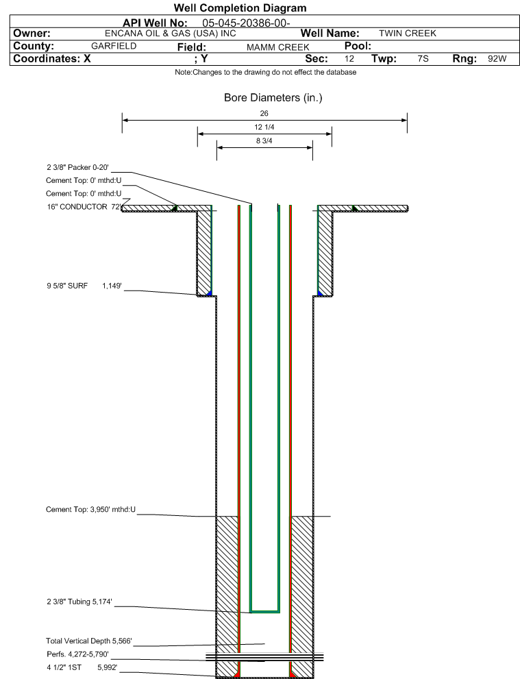 | Wellbore Completed | | Completion Date: | 4/5/2012 | | Spud Date: | 1/20/2012 | Spud Date Is: | ACTUAL | | Measured TD: | 6008 ft. | Measured PB depth: | 5945 ft. | | True Vertical TD: | 5566 ft. | True Vertical PB depth: | 5503 ft. | | Top PZ Location: | Sec:12 Twp: 7S 92W | Footage: 1042 FNL 2365 FWL | | Bottom Hole Location: | Sec:12 Twp: 7S 92W | Footage: 1064 FNL 2398 FWL | | Log Types: | RST, CBL (included on Neutron Log) and Mud. | | Casing: | String Type: CONDUCTOR, Hole Size: 26 in., Size: 16 in., Top: 0 ft., Depth: 72 ft., Weight: 42 , Citings Type: ACTUAL | | Cement: | Sacks: 40, Top: 0 ft., Bottom: 72 ft., Determination Method: CALC | | Casing: | String Type: SURF, Hole Size: 12.25 in., Size: 9.625 in., Top: 0 ft., Depth: 1149 ft., Weight: 36 , Citings Type: ACTUAL | | Cement: | Sacks: 534, Top: 0 ft., Bottom: 1149 ft., Determination Method: CALC | | Casing: | String Type: 1ST, Hole Size: 8.75 in., Size: 4.5 in., Top: 0 ft., Depth: 5992 ft., Weight: 11.6 , Citings Type: ACTUAL | | Cement: | Sacks: 1734, Top: 3950 ft., Bottom: 6008 ft., Determination Method: CBL | | Additional Cement: | String Type: 1ST , Top: 200 ft., Depth: 3011 ft., Bottom: 3011 ft., Sacks: 100, Method: DV TOOL | | Formation | Interval Top | Log Bottom | Cored | DSTs | | MESAVERDE | 2749 ft. | 3447 ft. | N | N | | WILLIAMS FORK | 3448 ft. | 5847 ft. | N | N |