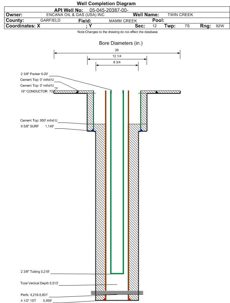 Wellbore #00 Wellbore Classification: GW Status: PR - 10/1/2017 Measured TD: 5970 ft. Vertical TD: 5513 ft.| Wellbore Data for Original Wellbore | Wellbore Classification: GW PR - 10/1/2017 | | Wellbore Permit | DIRECTIONAL | | Permit #: | | Expiration Date: | 1/30/2013 | | Proposed Top PZ Location: | Sec:12 Twp: 7S 92W | Footage: 1035 FNL 660 FWL | | Bottom Hole Location: | Sec:12 Twp: 7S 92W | Footage: 1035 FNL 660 FWL | | Proposed Depth/Form: | 6873 ft. | | Surface Mineral Owner Same: | No | | Mineral Owner: | FEE | Surface Owner: | FEE | | Unit: | | Unit Number: | | | Formation And Spacing: | Code: ILES , Formation: ILES , Order: , Unit Acreage: , Drill Unit: | | Formation And Spacing: | Code: WMFK , Formation: WILLIAMS FORK , Order: 191-76 , Unit Acreage: , Drill Unit: | | Casing: | String Type: CONDUCTOR, Hole Size: 20 in., Size: 16 in., Top: , Depth: 40 ft., Weight: LINEPIPE , Citings Type: PLANNED | | Cement: | Sacks: 0, Top: 0 ft., Bottom: 40 ft. | | Casing: | String Type: SURF, Hole Size: 12.25 in., Size: 9.625 in., Top: , Depth: 1137 ft., Weight: 36 , Citings Type: PLANNED | | Cement: | Sacks: 548, Top: 0 ft., Bottom: 1137 ft. | | Casing: | String Type: 1ST, Hole Size: 7.875 in., Size: 4.5 in., Top: , Depth: 6873 ft., Weight: 11.6 , Citings Type: PLANNED | | Cement: | Sacks: 648, Top: 0 ft., Bottom: 6873 ft. |