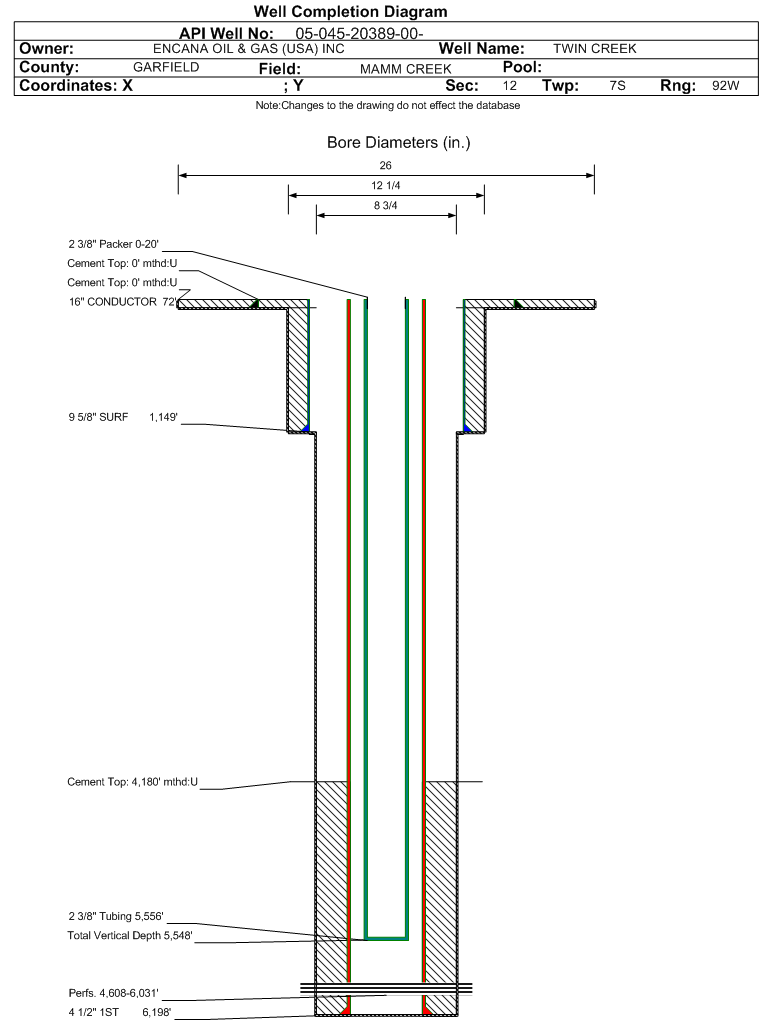 | Wellbore Completed | | Completion Date: | 3/11/2012 | | Spud Date: | 1/24/2012 | Spud Date Is: | ACTUAL | | Measured TD: | 6215 ft. | Measured PB depth: | 6100 ft. | | True Vertical TD: | 5548 ft. | True Vertical PB depth: | 5433 ft. | | Top PZ Location: | Sec:12 Twp: 7S 92W | Footage: 618 FNL 714 FWL | | Bottom Hole Location: | Sec:12 Twp: 7S 92W | Footage: 579 FNL 669 FWL | | Log Types: | RST, CBL (included in Neutron Log) and Mud. | | Casing: | String Type: CONDUCTOR, Hole Size: 26 in., Size: 16 in., Top: 0 ft., Depth: 72 ft., Weight: 42 , Citings Type: ACTUAL | | Cement: | Sacks: 40, Top: 0 ft., Bottom: 72 ft., Determination Method: CALC | | Casing: | String Type: SURF, Hole Size: 12.25 in., Size: 9.625 in., Top: 0 ft., Depth: 1149 ft., Weight: 36 , Citings Type: ACTUAL | | Cement: | Sacks: 547, Top: 0 ft., Bottom: 1170 ft., Determination Method: CALC | | Casing: | String Type: 1ST, Hole Size: 8.75 in., Size: 4.5 in., Top: 0 ft., Depth: 6198 ft., Weight: 11.6 , Citings Type: ACTUAL | | Cement: | Sacks: 1835, Top: 4180 ft., Bottom: 6215 ft., Determination Method: CBL | | Formation | Interval Top | Log Bottom | Cored | DSTs | | MESAVERDE | 3194 ft. | 3866 ft. | N | N | | WILLIAMS FORK | 3867 ft. | 6215 ft. | N | N |
