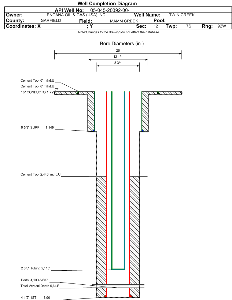| Wellbore Completed | | Completion Date: | 3/25/2012 | | Spud Date: | 1/21/2012 | Spud Date Is: | ACTUAL | | Measured TD: | 5920 ft. | Measured PB depth: | 5766 ft. | | True Vertical TD: | 5614 ft. | True Vertical PB depth: | 5460 ft. | | Top PZ Location: | Sec:12 Twp: 7S 92W | Footage: 1263 FNL 2171 FWL | | Bottom Hole Location: | Sec:12 Twp: 7S 92W | Footage: 1279 FNL 2188 FWL | | Log Types: | RST, CBL (included on Neutron Log) and Mud. | | Casing: | String Type: CONDUCTOR, Hole Size: 26 in., Size: 16 in., Top: 0 ft., Depth: 72 ft., Weight: 42 , Citings Type: ACTUAL | | Cement: | Sacks: 40, Top: 0 ft., Bottom: 72 ft., Determination Method: CALC | | Casing: | String Type: SURF, Hole Size: 12.25 in., Size: 9.625 in., Top: 0 ft., Depth: 1149 ft., Weight: 36 , Citings Type: ACTUAL | | Cement: | Sacks: 540, Top: 0 ft., Bottom: 1149 ft., Determination Method: CALC | | Casing: | String Type: 1ST, Hole Size: 8.75 in., Size: 4.5 in., Top: 0 ft., Depth: 5901 ft., Weight: 11.6 , Citings Type: ACTUAL | | Cement: | Sacks: 1675, Top: 2440 ft., Bottom: 5920 ft., Determination Method: CBL | | Formation | Interval Top | Log Bottom | Cored | DSTs | | MESAVERDE | 2630 ft. | 3301 ft. | N | N | | WILLIAMS FORK | 3302 ft. | 5920 ft. | N | N |