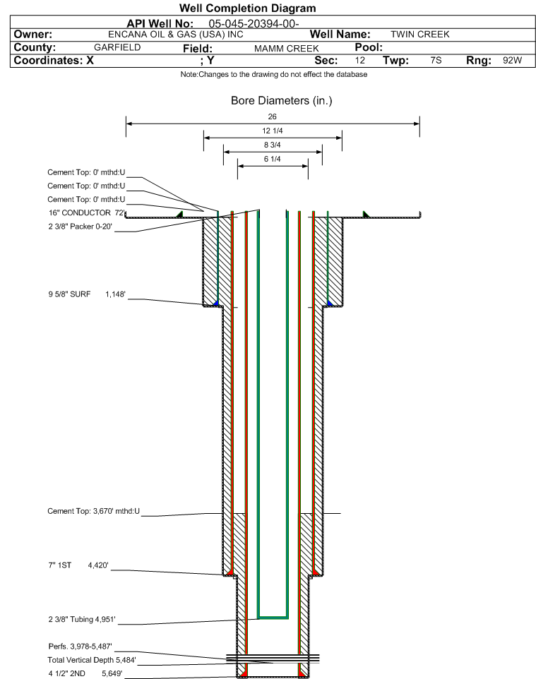 | Wellbore Completed | | Completion Date: | 5/2/2012 | | Spud Date: | 1/18/2012 | Spud Date Is: | ACTUAL | | Measured TD: | 5670 ft. | Measured PB depth: | 5601 ft. | | True Vertical TD: | 5484 ft. | True Vertical PB depth: | 5415 ft. | | Top PZ Location: | Sec:12 Twp: 7S 92W | Footage: 1599 FNL 2031 FWL | | Bottom Hole Location: | Sec:12 Twp: 7S 92W | Footage: 1600 FNL 2039 FWL | | Log Types: | RST, CBL (included in Neutron Log) and Mud. | | Casing: | String Type: CONDUCTOR, Hole Size: 26 in., Size: 16 in., Top: 0 ft., Depth: 72 ft., Weight: 42 , Citings Type: ACTUAL | | Cement: | Sacks: 40, Top: 0 ft., Bottom: 72 ft., Determination Method: CALC | | Casing: | String Type: SURF, Hole Size: 12.25 in., Size: 9.625 in., Top: 0 ft., Depth: 1148 ft., Weight: 36 , Citings Type: ACTUAL | | Cement: | Sacks: 532, Top: 0 ft., Bottom: 1170 ft., Determination Method: CALC | | Casing: | String Type: 1ST, Hole Size: 8.75 in., Size: 7 in., Top: 0 ft., Depth: 4420 ft., Weight: 23 , Citings Type: ACTUAL | | Cement: | Sacks: 830, Top: 0 ft., Bottom: 4463 ft., Determination Method: CALC | | Casing: | String Type: 2ND, Hole Size: 6.25 in., Size: 4.5 in., Top: 0 ft., Depth: 5649 ft., Weight: 11.6 , Citings Type: ACTUAL | | Cement: | Sacks: 251, Top: 3670 ft., Bottom: 5670 ft., Determination Method: CBL | | Formation | Interval Top | Log Bottom | Cored | DSTs | | MESAVERDE | 2557 ft. | 3179 ft. | N | N | | WILLIAMS FORK | 3180 ft. | 5670 ft. | N | N |