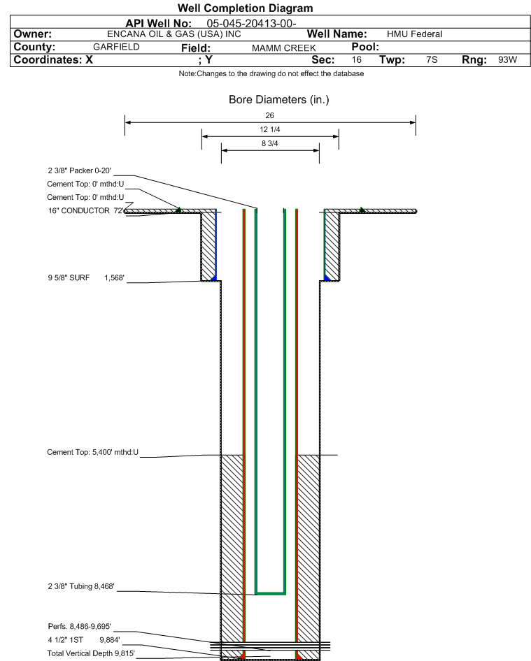 | Wellbore Completed | | Completion Date: | 2/7/2012 | | Spud Date: | 1/4/2012 | Spud Date Is: | ACTUAL | | Measured TD: | 9915 ft. | Measured PB depth: | 8770 ft. | | True Vertical TD: | 9815 ft. | True Vertical PB depth: | 8670 ft. | | Top PZ Location: | Sec:16 Twp: 7S 93W | Footage: 1363 FSL 2368 FWL | | Bottom Hole Location: | Sec:16 Twp: 7S 93W | Footage: 1366 FSL 2358 FWL | | Log Types: | RST, CBL (included in Neutron Log) and Mud. | | Casing: | String Type: CONDUCTOR, Hole Size: 26 in., Size: 16 in., Top: 0 ft., Depth: 72 ft., Weight: 42 , Citings Type: ACTUAL | | Cement: | Sacks: 40, Top: 0 ft., Bottom: 72 ft., Determination Method: CALC | | Casing: | String Type: SURF, Hole Size: 12.25 in., Size: 9.625 in., Top: 0 ft., Depth: 1568 ft., Weight: 36 , Citings Type: ACTUAL | | Cement: | Sacks: 434, Top: 0 ft., Bottom: 1568 ft., Determination Method: CALC | | Casing: | String Type: 1ST, Hole Size: 8.75 in., Size: 4.5 in., Top: 0 ft., Depth: 9884 ft., Weight: 11.6 , Citings Type: ACTUAL | | Cement: | Sacks: 926, Top: 5400 ft., Bottom: 9915 ft., Determination Method: CBL | | Formation | Interval Top | Log Bottom | Cored | DSTs | | WILLIAMS FORK | 6141 ft. | 9721 ft. | N | N | | ROLLINS | 9722 ft. | 9915 ft. | N | N |