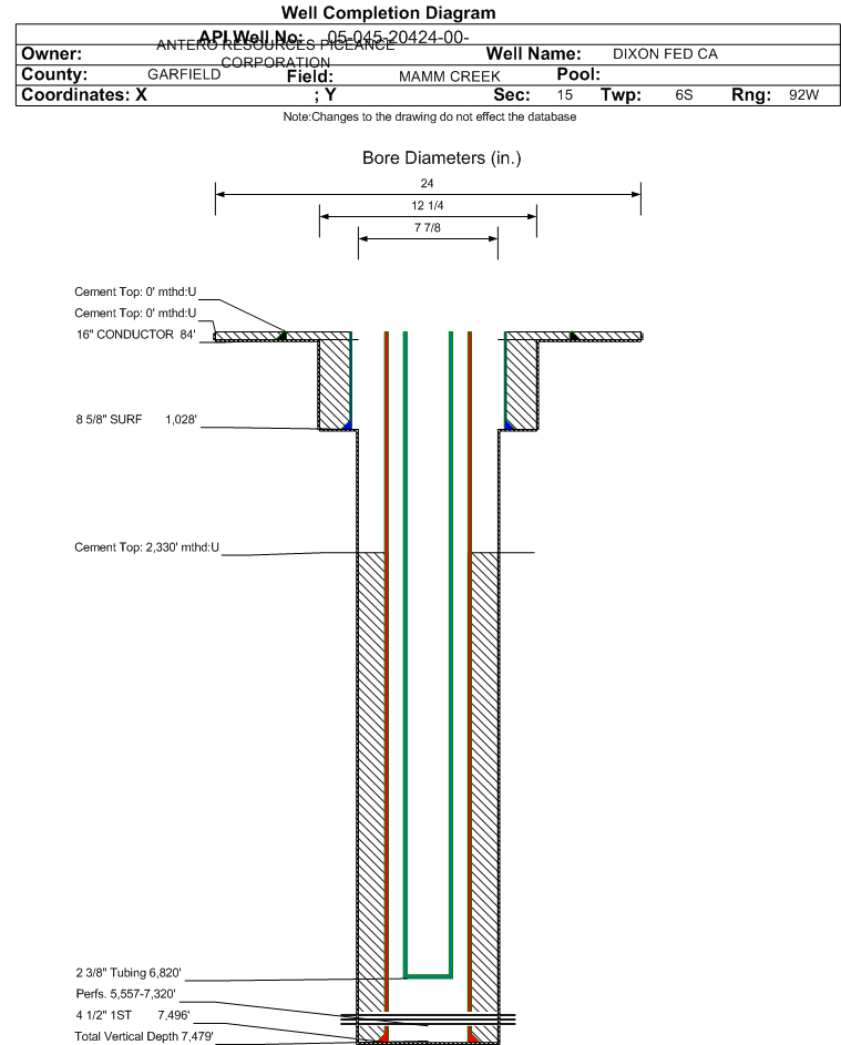 Wellbore #00 Wellbore Classification: GW Status: PR - 2/1/2022 Measured TD: 7505 ft. Vertical TD: 7479 ft.| Wellbore Data for Original Wellbore | Wellbore Classification: GW PR - 2/1/2022 | | Wellbore Permit | DIRECTIONAL | | Permit #: | | Expiration Date: | 2/17/2013 | | Proposed Top PZ Location: | Sec:15 Twp: 6S 92W | Footage: 1815 FSL 597 FWL | | Bottom Hole Location: | Sec:15 Twp: 6S 92W | Footage: 1815 FSL 597 FWL | | Proposed Depth/Form: | 7575 ft. | | Surface Mineral Owner Same: | Yes | | Mineral Owner: | FEE | Surface Owner: | FEE | | Unit: | | Unit Number: | | | Formation And Spacing: | Code: ILES , Formation: ILES , Order: 191-25 , Unit Acreage: 320, Drill Unit: S/2 | | Formation And Spacing: | Code: WMFK , Formation: WILLIAMS FORK , Order: 191-24 , Unit Acreage: 320, Drill Unit: S/2 | | Casing: | String Type: CONDUCTOR, Hole Size: 24 in., Size: 16 in., Top: 0 ft., Depth: 60 ft., Weight: 55# , Citings Type: PLANNED | | Cement: | Sacks: 177, Top: 0 ft., Bottom: 60 ft. | | Casing: | String Type: SURF, Hole Size: 12.25 in., Size: 8.625 in., Top: 0 ft., Depth: 1000 ft., Weight: 24/32# , Citings Type: PLANNED | | Cement: | Sacks: 416, Top: 0 ft., Bottom: 1000 ft. | | Casing: | String Type: 1ST, Hole Size: 7.875 in., Size: 4.5 in., Top: 0 ft., Depth: 7575 ft., Weight: 11.6# , Citings Type: PLANNED | | Cement: | Sacks: 356, Top: , Bottom: 7575 ft. |