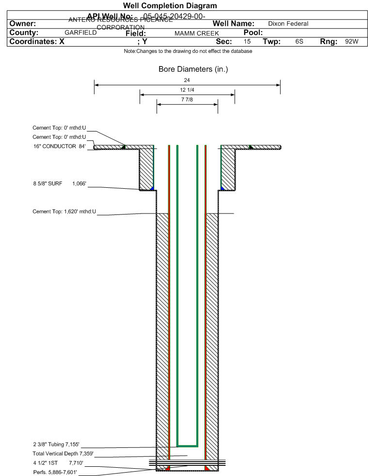 Wellbore #00 Wellbore Classification: GW Status: PR - 2/1/2022 Measured TD: 7712 ft. Vertical TD: 7359 ft.| Wellbore Data for Original Wellbore | Wellbore Classification: GW PR - 2/1/2022 | | Wellbore Permit | DIRECTIONAL | | Permit #: | | Expiration Date: | 2/26/2013 | | Proposed Top PZ Location: | Sec:15 Twp: 6S 92W | Footage: 735 FSL 1971 FWL | | Bottom Hole Location: | Sec:15 Twp: 6S 92W | Footage: 735 FSL 1971 FWL | | Proposed Depth/Form: | 7790 ft. | | Surface Mineral Owner Same: | No | | Mineral Owner: | FEDERAL | Surface Owner: | FEE | | Unit: | | Unit Number: | | | Formation And Spacing: | Code: ILES , Formation: ILES , Order: 191-25 , Unit Acreage: 320, Drill Unit: S/2 | | Formation And Spacing: | Code: WMFK , Formation: WILLIAMS FORK , Order: 191-24 , Unit Acreage: 320, Drill Unit: S/2 | | Casing: | String Type: CONDUCTOR, Hole Size: 24 in., Size: 16 in., Top: 0 ft., Depth: 60 ft., Weight: 55# , Citings Type: PLANNED | | Cement: | Sacks: 177, Top: 0 ft., Bottom: 60 ft. | | Casing: | String Type: SURF, Hole Size: 12.25 in., Size: 8.625 in., Top: 0 ft., Depth: 1000 ft., Weight: 24/32# , Citings Type: PLANNED | | Cement: | Sacks: 416, Top: 0 ft., Bottom: 1000 ft. | | Casing: | String Type: 1ST, Hole Size: 7.875 in., Size: 4.5 in., Top: 0 ft., Depth: 7790 ft., Weight: 11.6# , Citings Type: PLANNED | | Cement: | Sacks: 356, Top: , Bottom: 7790 ft. |