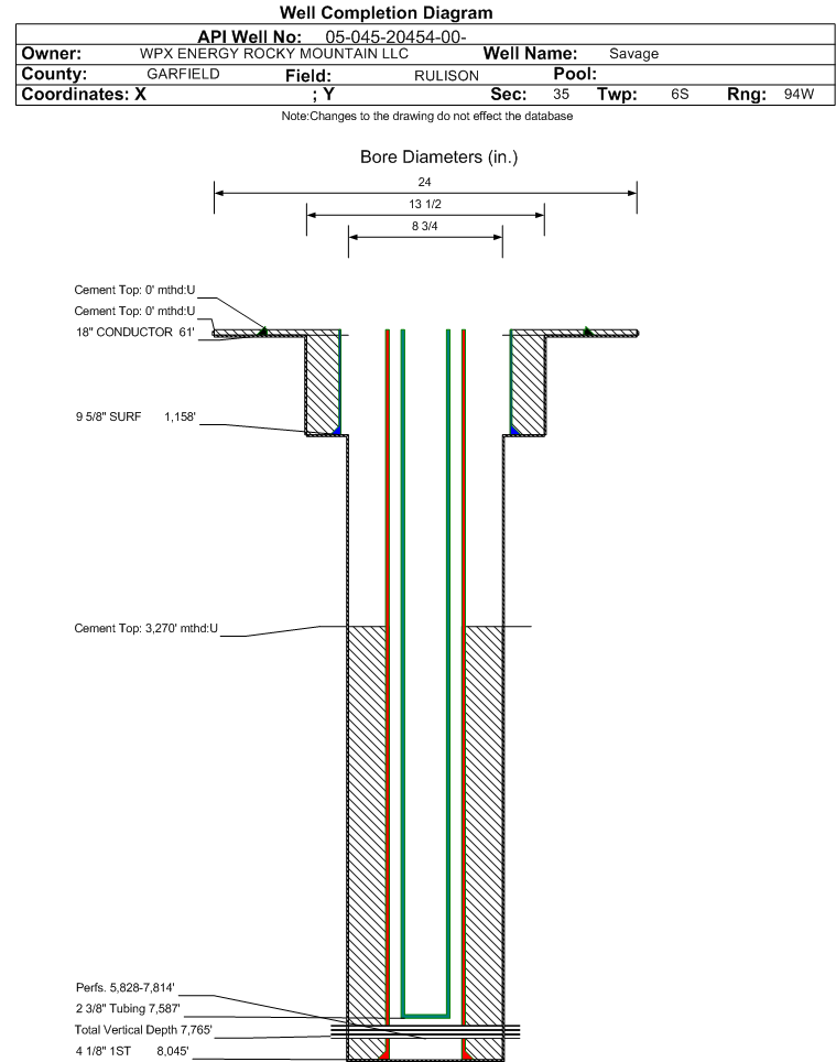 Wellbore #00 Wellbore Classification: GW Status: SI - 5/1/2024 Measured TD: 8065 ft. Vertical TD: 7765 ft.| Wellbore Data for Original Wellbore | Wellbore Classification: GW SI - 5/1/2024 | | Wellbore Permit | DIRECTIONAL | | Permit #: | | Expiration Date: | 3/6/2013 | | Proposed Top PZ Location: | Sec:35 Twp: 6S 94W | Footage: 2381 FSL 1915 FWL | | Bottom Hole Location: | Sec:35 Twp: 6S 94W | Footage: 2353 FSL 1914 FWL | | Proposed Depth/Form: | 7950 ft. | | Surface Mineral Owner Same: | No | | Mineral Owner: | FEDERAL | Surface Owner: | FEE | | Unit: | | Unit Number: | | | Formation And Spacing: | Code: WMFK , Formation: WILLIAMS FORK , Order: 139-66 , Unit Acreage: 640, Drill Unit: All | | Casing: | String Type: CONDUCTOR, Hole Size: 24 in., Size: , Top: 0 ft., Depth: 45 ft., Weight: 48# , Citings Type: PLANNED | | Cement: | Sacks: 25, Top: 0 ft., Bottom: 45 ft. | | Casing: | String Type: SURF, Hole Size: 13.5 in., Size: 9.625 in., Top: 0 ft., Depth: 1125 ft., Weight: 32.3# , Citings Type: PLANNED | | Cement: | Sacks: 392, Top: 0 ft., Bottom: 1125 ft. | | Casing: | String Type: 1ST, Hole Size: 7.875 in., Size: 4.5 in., Top: 0 ft., Depth: 7950 ft., Weight: 11.6# , Citings Type: PLANNED | | Cement: | Sacks: 632, Top: , Bottom: 7950 ft. |