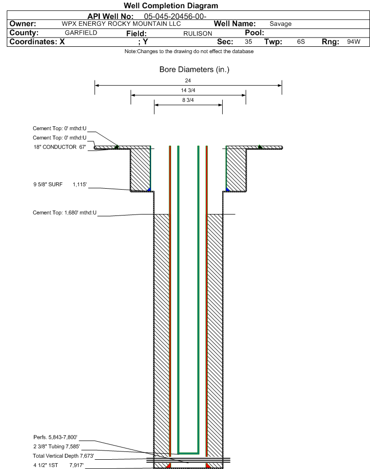 Wellbore #00 Wellbore Classification: GW Status: PR - 9/13/2012 Measured TD: 7942 ft. Vertical TD: 7673 ft.| Wellbore Data for Original Wellbore | Wellbore Classification: GW PR - 9/13/2012 | | Wellbore Permit | DIRECTIONAL | | Permit #: | | Expiration Date: | 3/6/2013 | | Proposed Top PZ Location: | Sec:34 Twp: 6S 94W | Footage: 1045 FNL 693 FEL | | Bottom Hole Location: | Sec:34 Twp: 6S 94W | Footage: 1053 FNL 691 FEL | | Proposed Depth/Form: | 7935 ft. | | Surface Mineral Owner Same: | Yes | | Mineral Owner: | FEE | Surface Owner: | FEE | | Unit: | | Unit Number: | | | Formation And Spacing: | Code: WMFK , Formation: WILLIAMS FORK , Order: 139-66 , Unit Acreage: 640, Drill Unit: All | | Casing: | String Type: CONDUCTOR, Hole Size: 24 in., Size: 18 in., Top: 0 ft., Depth: 45 ft., Weight: 48# , Citings Type: PLANNED | | Cement: | Sacks: 25, Top: 0 ft., Bottom: 45 ft. | | Casing: | String Type: SURF, Hole Size: 13.5 in., Size: 9.625 in., Top: 0 ft., Depth: 1125 ft., Weight: 32.3# , Citings Type: PLANNED | | Cement: | Sacks: 392, Top: 0 ft., Bottom: 1125 ft. | | Casing: | String Type: 1ST, Hole Size: 7.875 in., Size: 4.5 in., Top: 0 ft., Depth: 7935 ft., Weight: 11.6# , Citings Type: PLANNED | | Cement: | Sacks: 630, Top: , Bottom: 7935 ft. |