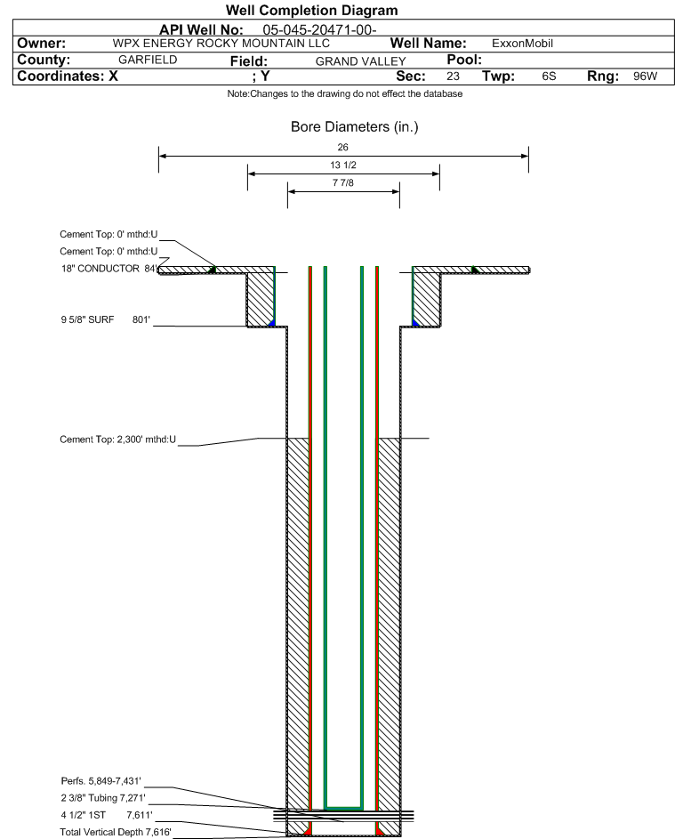 | Wellbore Completed | | Completion Date: | 7/16/2011 | | Spud Date: | 7/10/2011 | Spud Date Is: | ACTUAL | | Measured TD: | 7622 ft. | Measured PB depth: | 7577 ft. | | True Vertical TD: | 7616 ft. | True Vertical PB depth: | 7570 ft. | | Top PZ Location: | Sec:23 Twp: 6s 96w | Footage: 1978 FSL 636 FWL | | Bottom Hole Location: | Sec:23 Twp: 6s 96w | Footage: 1970 FSL 619 FWL | | Log Types: | CBL, MUD, & RPM | | Casing: | String Type: CONDUCTOR, Hole Size: 26 in., Size: 18 in., Top: 0 ft., Depth: 84 ft., Weight: 48 , Citings Type: ACTUAL | | Cement: | Sacks: 31, Top: 0 ft., Bottom: 84 ft., Determination Method: VISU | | Casing: | String Type: SURF, Hole Size: 13.5 in., Size: 9.625 in., Top: 0 ft., Depth: 801 ft., Weight: 32.3 , Citings Type: ACTUAL | | Cement: | Sacks: 235, Top: 0 ft., Bottom: 801 ft., Determination Method: VISU | | Casing: | String Type: 1ST, Hole Size: 7.875 in., Size: 4.5 in., Top: 0 ft., Depth: 7611 ft., Weight: 11.6 , Citings Type: ACTUAL | | Cement: | Sacks: 1005, Top: 2300 ft., Bottom: 7611 ft., Determination Method: CBL | | Formation | Interval Top | Log Bottom | Cored | DSTs | | WASATCH | 2519 ft. | | | | | MESAVERDE | 4375 ft. | | | | | CAMEO | 6986 ft. | | | | | ROLLINS | 7507 ft. | | | |