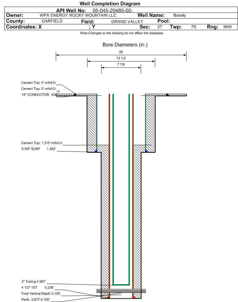 Wellbore #00 Wellbore Classification: GW Status: PR - 1/11/2012 Measured TD: 5260 ft. Vertical TD: 5150 ft.| Wellbore Data for Original Wellbore | Wellbore Classification: GW PR - 1/11/2012 | | Wellbore Permit | DIRECTIONAL | | Permit #: | | Expiration Date: | 3/10/2013 | | Proposed Top PZ Location: | Sec:27 Twp: 7S 96W | Footage: 446 FNL 1862 FEL | | Bottom Hole Location: | Sec:27 Twp: 7S 96W | Footage: 446 FNL 1862 FEL | | Proposed Depth/Form: | 5264 ft. | | Surface Mineral Owner Same: | Yes | | Mineral Owner: | FEE | Surface Owner: | FEE | | Unit: | | Unit Number: | | | Formation And Spacing: | Code: WMFK , Formation: WILLIAMS FORK , Order: 510-14 , Unit Acreage: 160, Drill Unit: NE/4 | | Casing: | String Type: CONDUCTOR, Hole Size: 24 in., Size: 18 in., Top: 0 ft., Depth: 45 ft., Weight: 48# , Citings Type: PLANNED | | Cement: | Sacks: 25, Top: 0 ft., Bottom: 45 ft. | | Casing: | String Type: SURF, Hole Size: 13.5 in., Size: 9.625 in., Top: 0 ft., Depth: 1470 ft., Weight: 32.3# , Citings Type: PLANNED | | Cement: | Sacks: 513, Top: 0 ft., Bottom: 1470 ft. | | Casing: | String Type: 1ST, Hole Size: 7.875 in., Size: 4.5 in., Top: 0 ft., Depth: 5264 ft., Weight: 11.6# , Citings Type: PLANNED | | Cement: | Sacks: 509, Top: , Bottom: 5264 ft. |