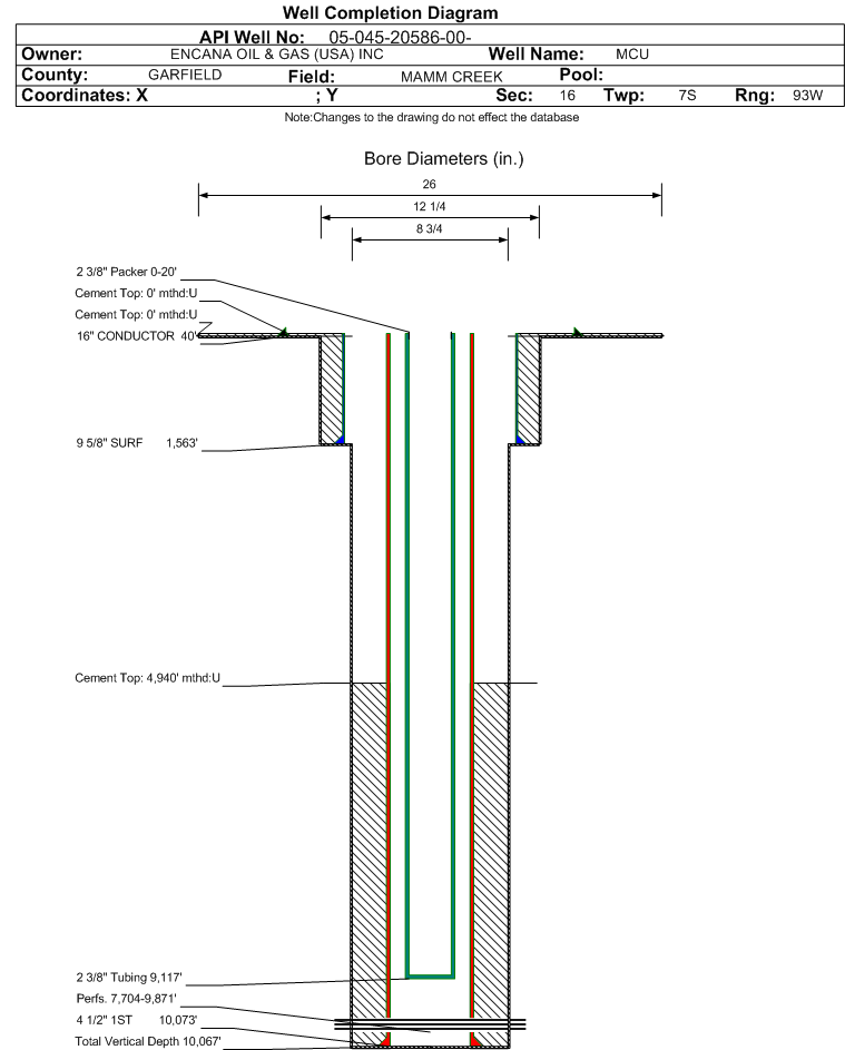Wellbore #00 Wellbore Classification: GW Status: PR - 1/11/2013 Measured TD: 10105 ft. Vertical TD: 10067 ft.| Wellbore Data for Original Wellbore | Wellbore Classification: GW PR - 1/11/2013 | | Wellbore Permit | DIRECTIONAL | | Permit #: | | Expiration Date: | 4/5/2013 | | Proposed Top PZ Location: | Sec:16 Twp: 7S 93W | Footage: 940 FSL 640 FWL | | Bottom Hole Location: | Sec:16 Twp: 7S 93W | Footage: 940 FSL 640 FWL | | Proposed Depth/Form: | 10320 ft. | | Surface Mineral Owner Same: | Yes | | Mineral Owner: | FEDERAL | Surface Owner: | FEDERAL | | Unit: | Middleton Creek | Unit Number: | COC068997X | | Formation And Spacing: | Code: MVRD , Formation: MESAVERDE , Order: , Unit Acreage: , Drill Unit: | | Casing: | String Type: CONDUCTOR, Hole Size: 24 in., Size: 16 in., Top: 0 ft., Depth: 40 ft., Weight: 65 , Citings Type: PLANNED | | Cement: | Sacks: 5, Top: 0 ft., Bottom: 40 ft. | | Casing: | String Type: SURF, Hole Size: 12.25 in., Size: 9.625 in., Top: 0 ft., Depth: 1548 ft., Weight: 36 , Citings Type: PLANNED | | Cement: | Sacks: 473, Top: 0 ft., Bottom: 1548 ft. | | Casing: | String Type: 1ST, Hole Size: 7.875 in., Size: 4.5 in., Top: 0 ft., Depth: 10320 ft., Weight: 11.6 , Citings Type: PLANNED | | Cement: | Sacks: 726, Top: 0 ft., Bottom: 10320 ft. |