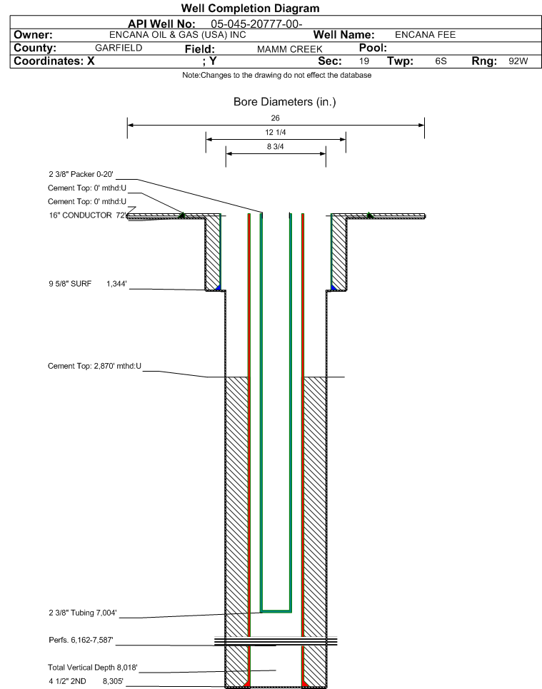 Wellbore #00 Wellbore Classification: GW Status: PR - 7/30/2012 Measured TD: 8340 ft. Vertical TD: 8018 ft.| Wellbore Data for Original Wellbore | Wellbore Classification: GW PR - 7/30/2012 | | Wellbore Permit | DIRECTIONAL | | Permit #: | | Expiration Date: | 6/7/2013 | | Proposed Top PZ Location: | Sec:19 Twp: 6S 92W | Footage: 2380 FSL 2001 FEL | | Bottom Hole Location: | Sec:19 Twp: 6S 92W | Footage: 2380 FSL 2001 FEL | | Proposed Depth/Form: | 8594 ft. | | Surface Mineral Owner Same: | No | | Mineral Owner: | FEE | Surface Owner: | FEE | | Unit: | | Unit Number: | | | Formation And Spacing: | Code: WMFK , Formation: WILLIAMS FORK , Order: 191-8 , Unit Acreage: , Drill Unit: | | Casing: | String Type: CONDUCTOR, Hole Size: 20 in., Size: 16 in., Top: 0 ft., Depth: 40 ft., Weight: LINEPIPE , Citings Type: PLANNED | | Cement: | Sacks: 5, Top: 0 ft., Bottom: 40 ft. | | Casing: | String Type: SURF, Hole Size: 12.25 in., Size: 9.625 in., Top: 0 ft., Depth: 1289 ft., Weight: 36 , Citings Type: PLANNED | | Cement: | Sacks: 404, Top: 0 ft., Bottom: 1289 ft. | | Casing: | String Type: 1ST, Hole Size: 7.875 in., Size: 4.5 in., Top: 0 ft., Depth: 8594 ft., Weight: 11.6 , Citings Type: PLANNED | | Cement: | Sacks: 611, Top: 0 ft., Bottom: 8594 ft. |