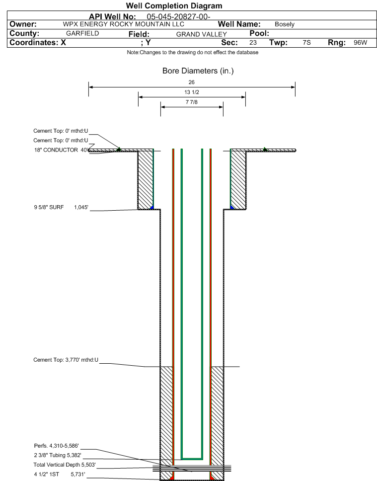 Wellbore #00 Wellbore Classification: GW Status: PR - 5/8/2012 Measured TD: 5750 ft. Vertical TD: 5503 ft.| Wellbore Data for Original Wellbore | Wellbore Classification: GW PR - 5/8/2012 | | Wellbore Permit | DIRECTIONAL | | Permit #: | | Expiration Date: | 7/4/2013 | | Proposed Top PZ Location: | Sec:23 Twp: 7S 96W | Footage: 323 FNL 568 FWL | | Bottom Hole Location: | Sec:23 Twp: 7S 96W | Footage: 323 FNL 568 FWL | | Proposed Depth/Form: | 5925 ft. | | Surface Mineral Owner Same: | No | | Mineral Owner: | FEDERAL | Surface Owner: | FEE | | Unit: | | Unit Number: | | | Formation And Spacing: | Code: WMFK , Formation: WILLIAMS FORK , Order: 510-14 , Unit Acreage: , Drill Unit: | | Casing: | String Type: CONDUCTOR, Hole Size: 24 in., Size: 18 in., Top: 0 ft., Depth: 45 ft., Weight: 48# , Citings Type: PLANNED | | Cement: | Sacks: 25, Top: 0 ft., Bottom: 45 ft. | | Casing: | String Type: SURF, Hole Size: 13.5 in., Size: 9.625 in., Top: 0 ft., Depth: 916 ft., Weight: 32.3# , Citings Type: PLANNED | | Cement: | Sacks: 245, Top: 0 ft., Bottom: 916 ft. | | Casing: | String Type: 1ST, Hole Size: 7.875 in., Size: 4.5 in., Top: 0 ft., Depth: 5925 ft., Weight: 11.6# , Citings Type: PLANNED | | Cement: | Sacks: 543, Top: , Bottom: 5925 ft. |