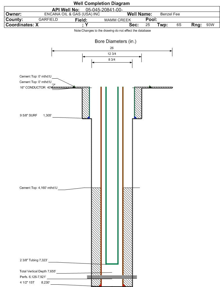 Wellbore #00 Wellbore Classification: GW Status: PR - 1/1/2014 Measured TD: 8240 ft. Vertical TD: 7655 ft.| Wellbore Data for Original Wellbore | Wellbore Classification: GW PR - 1/1/2014 | | Wellbore Permit | DIRECTIONAL | | Permit #: | | Expiration Date: | 7/5/2013 | | Proposed Top PZ Location: | Sec:25 Twp: 6S 93W | Footage: 1792 FNL 670 FEL | | Bottom Hole Location: | Sec:25 Twp: 6S 93W | Footage: 1792 FNL 670 FEL | | Proposed Depth/Form: | 8547 ft. | | Surface Mineral Owner Same: | No | | Mineral Owner: | FEE | Surface Owner: | FEE | | Unit: | Grass Mesa Unit | Unit Number: | COC-056608X | | Formation And Spacing: | Code: WMFK , Formation: WILLIAMS FORK , Order: , Unit Acreage: , Drill Unit: | | Casing: | String Type: CONDUCTOR, Hole Size: 24 in., Size: 16 in., Top: 0 ft., Depth: 40 ft., Weight: Linepipe , Citings Type: PLANNED | | Cement: | Sacks: 5, Top: 0 ft., Bottom: 40 ft. | | Casing: | String Type: SURF, Hole Size: 12.25 in., Size: 9.625 in., Top: 0 ft., Depth: 1285 ft., Weight: 36 , Citings Type: PLANNED | | Cement: | Sacks: 403, Top: 0 ft., Bottom: 1285 ft. | | Casing: | String Type: 2ND, Hole Size: 7.875 in., Size: 4.5 in., Top: 0 ft., Depth: 8547 ft., Weight: 12 , Citings Type: PLANNED | | Cement: | Sacks: 647, Top: , Bottom: 8547 ft. |