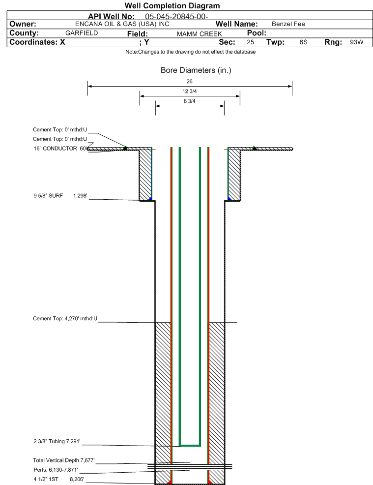 Wellbore #00 Wellbore Classification: GW Status: PR - 10/1/2024 Measured TD: 8225 ft. Vertical TD: 7677 ft.| Wellbore Data for Original Wellbore | Wellbore Classification: GW PR - 10/1/2024 | | Wellbore Permit | DIRECTIONAL | | Permit #: | | Expiration Date: | 7/7/2013 | | Proposed Top PZ Location: | Sec:25 Twp: 6S 93W | Footage: 1435 FNL 730 FEL | | Bottom Hole Location: | Sec:25 Twp: 6S 93W | Footage: 1435 FNL 730 FEL | | Proposed Depth/Form: | 8528 ft. | | Surface Mineral Owner Same: | No | | Mineral Owner: | FEE | Surface Owner: | FEE | | Unit: | Grass Mesa Unit | Unit Number: | COC-056608X | | Formation And Spacing: | Code: WMFK , Formation: WILLIAMS FORK , Order: , Unit Acreage: , Drill Unit: | | Casing: | String Type: CONDUCTOR, Hole Size: 24 in., Size: 16 in., Top: 0 ft., Depth: 40 ft., Weight: Linepipe , Citings Type: PLANNED | | Cement: | Sacks: 5, Top: 0 ft., Bottom: 40 ft. | | Casing: | String Type: SURF, Hole Size: 12.25 in., Size: 9.625 in., Top: 0 ft., Depth: 1280 ft., Weight: 36 , Citings Type: PLANNED | | Cement: | Sacks: 402, Top: 0 ft., Bottom: 1280 ft. | | Casing: | String Type: 2ND, Hole Size: 7.875 in., Size: 4.5 in., Top: 0 ft., Depth: 8528 ft., Weight: 12 , Citings Type: PLANNED | | Cement: | Sacks: 648, Top: , Bottom: 8528 ft. |