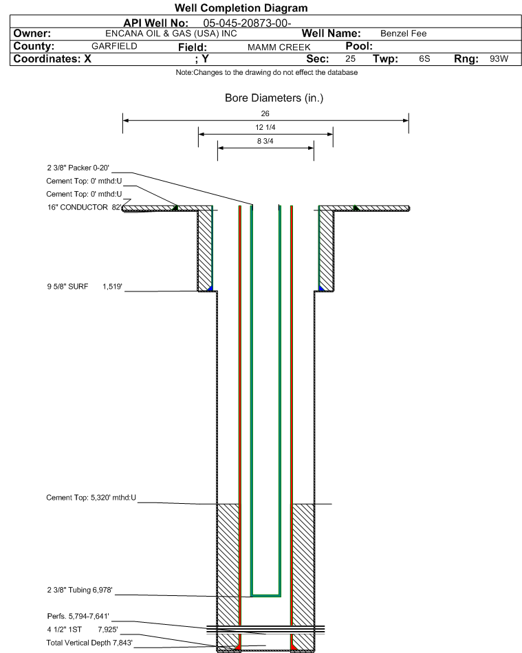 | Wellbore Completed | | Completion Date: | 11/24/2012 | | Spud Date: | 11/8/2012 | Spud Date Is: | ACTUAL | | Measured TD: | 7972 ft. | Measured PB depth: | 7972 ft. | | True Vertical TD: | 7843 ft. | True Vertical PB depth: | 7843 ft. | | Top PZ Location: | Sec:25 Twp: 6S 93W | Footage: 501 FNL 2570 FWL | | Bottom Hole Location: | Sec:25 Twp: 6S 93W | Footage: 512 FNL 2587 FWL | | Log Types: | RST, CBL (included in Neutron Log) and Mud. | | Casing: | String Type: CONDUCTOR, Hole Size: 26 in., Size: 16 in., Top: 0 ft., Depth: 82 ft., Weight: 42 , Citings Type: ACTUAL | | Cement: | Sacks: 0, Top: 0 ft., Bottom: 82 ft., Determination Method: CALC | | Casing: | String Type: SURF, Hole Size: 12.25 in., Size: 9.625 in., Top: 0 ft., Depth: 1519 ft., Weight: 36 , Citings Type: ACTUAL | | Cement: | Sacks: 540, Top: 0 ft., Bottom: 1519 ft., Determination Method: CALC | | Casing: | String Type: 1ST, Hole Size: 8.75 in., Size: 4.5 in., Top: 0 ft., Depth: 7925 ft., Weight: 11.60 , Citings Type: ACTUAL | | Cement: | Sacks: 1050, Top: 5320 ft., Bottom: 7972 ft., Determination Method: CBL | | Formation | Interval Top | Log Bottom | Cored | DSTs | | MESAVERDE | 3994 ft. | 4762 ft. | N | N | | WILLIAMS FORK | 4763 ft. | 7720 ft. | N | N | | ROLLINS | 7721 ft. | 7972 ft. | N | N |