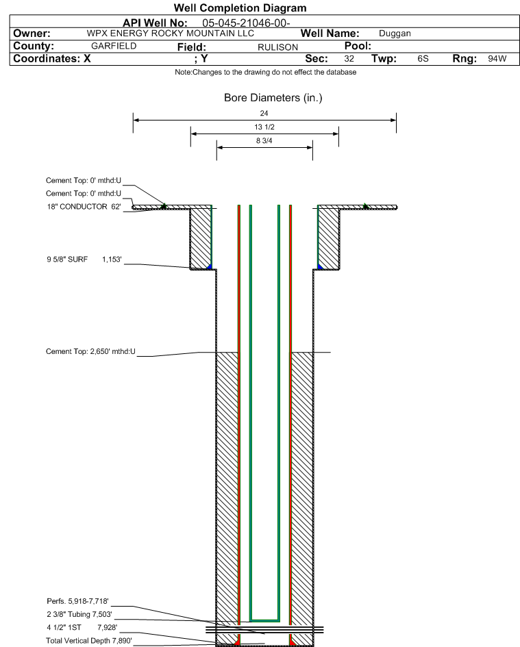 Wellbore #00 Wellbore Classification: GW Status: PR - 5/1/2012 Measured TD: 7945 ft. Vertical TD: 7890 ft.| Wellbore Data for Original Wellbore | Wellbore Classification: GW PR - 5/1/2012 | | Wellbore Permit | DIRECTIONAL | | Permit #: | | Expiration Date: | 9/7/2013 | | Proposed Top PZ Location: | Sec:32 Twp: 6S 94W | Footage: 1740 FNL 1708 FWL | | Bottom Hole Location: | Sec:32 Twp: 6S 94W | Footage: 1740 FNL 1708 FWL | | Proposed Depth/Form: | 8013 ft. | | Surface Mineral Owner Same: | No | | Mineral Owner: | FEE | Surface Owner: | FEE | | Unit: | | Unit Number: | | | Formation And Spacing: | Code: WMFk , Formation: WILLIAMS FORK , Order: 139-64 , Unit Acreage: 320, Drill Unit: N/2 Fee Pooled | | Casing: | String Type: CONDUCTOR, Hole Size: 24 in., Size: 18 in., Top: 0 ft., Depth: 45 ft., Weight: 48 , Citings Type: PLANNED | | Cement: | Sacks: 50, Top: 0 ft., Bottom: 45 ft. | | Casing: | String Type: SURF, Hole Size: 13.5 in., Size: 9.625 in., Top: 0 ft., Depth: 1108 ft., Weight: 32.3 , Citings Type: PLANNED | | Cement: | Sacks: 293, Top: 0 ft., Bottom: 1108 ft. | | Casing: | String Type: 1ST, Hole Size: 7.875 in., Size: 4.5 in., Top: 0 ft., Depth: 8013 ft., Weight: 11.6 , Citings Type: PLANNED | | Cement: | Sacks: 674, Top: 0 ft., Bottom: 8013 ft. |