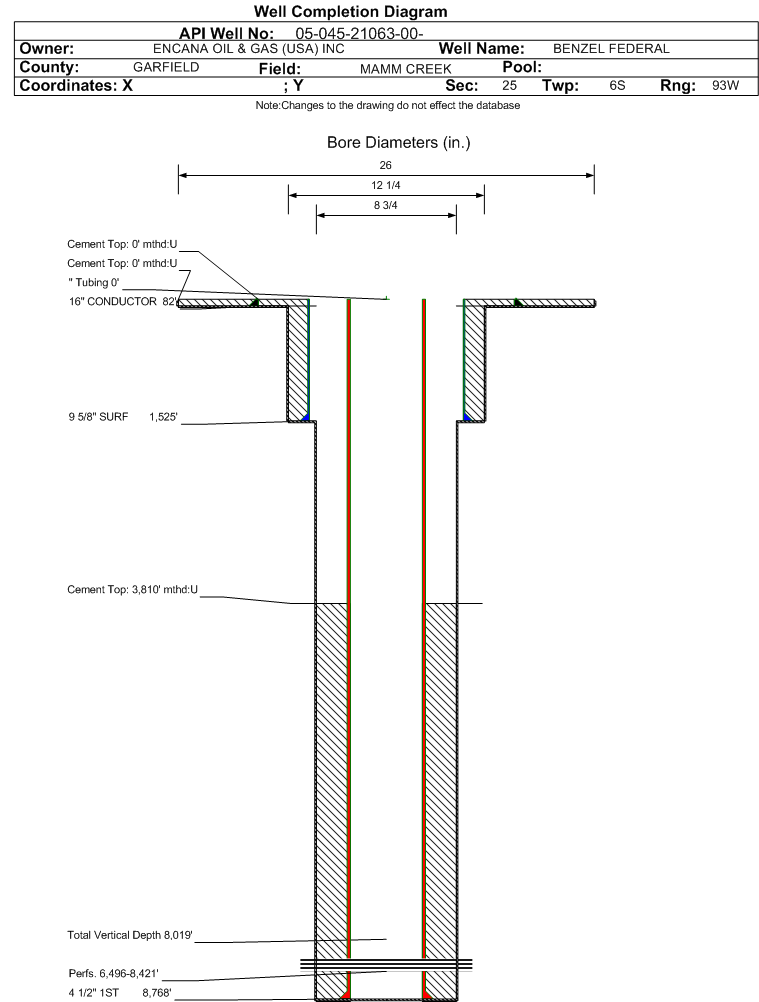 Wellbore #00 Wellbore Classification: GW Status: PR - 4/8/2013 Measured TD: 8800 ft. Vertical TD: 8019 ft.| Wellbore Data for Original Wellbore | Wellbore Classification: GW PR - 4/8/2013 | | Wellbore Permit | DIRECTIONAL | | Permit #: | | Expiration Date: | 10/5/2013 | | Proposed Top PZ Location: | Sec:24 Twp: 6S 93W | Footage: 238 FSL 450 FWL | | Bottom Hole Location: | Sec:24 Twp: 6S 93W | Footage: 238 FSL 450 FWL | | Proposed Depth/Form: | 10145 ft. | | Surface Mineral Owner Same: | No | | Mineral Owner: | FEDERAL | Surface Owner: | FEE | | Unit: | Grass Mesa Unit | Unit Number: | COC-056608X | | Formation And Spacing: | Code: ILES , Formation: ILES , Order: , Unit Acreage: , Drill Unit: | | Formation And Spacing: | Code: WMFK , Formation: WILLIAMS FORK , Order: , Unit Acreage: , Drill Unit: | | Casing: | String Type: CONDUCTOR, Hole Size: 24 in., Size: 16 in., Top: 0 ft., Depth: 40 ft., Weight: Linepipe , Citings Type: PLANNED | | Cement: | Sacks: 5, Top: 0 ft., Bottom: 40 ft. | | Casing: | String Type: SURF, Hole Size: 12.25 in., Size: 9.625 in., Top: 0 ft., Depth: 1525 ft., Weight: 36 , Citings Type: PLANNED | | Cement: | Sacks: 467, Top: 0 ft., Bottom: 1525 ft. | | Casing: | String Type: 2ND, Hole Size: 7.875 in., Size: 4.5 in., Top: 0 ft., Depth: 10145 ft., Weight: 12 , Citings Type: PLANNED | | Cement: | Sacks: 1143, Top: , Bottom: 10145 ft. |