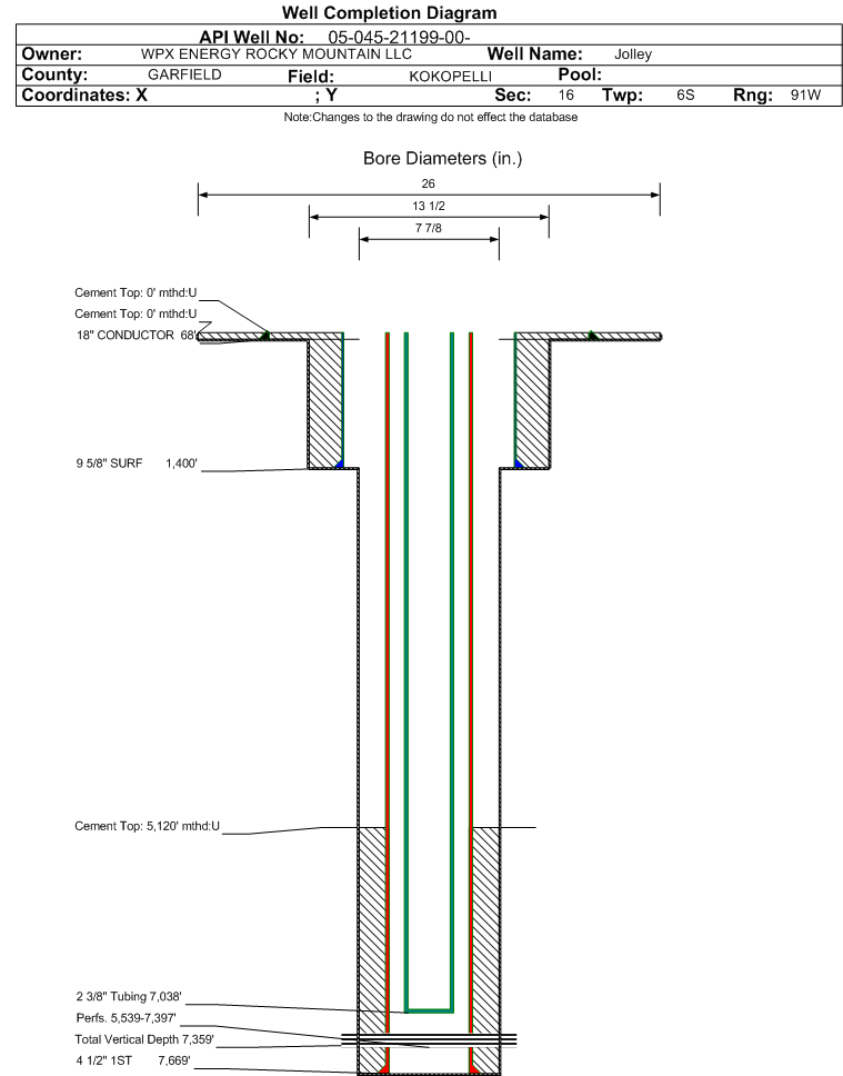 | | Log Types: | CBL, Mud, and Reservoir Performance Monitor (RPM) | | Casing: | String Type: CONDUCTOR, Hole Size: 26 in., Size: 18 in., Top: 0 ft., Depth: 68 ft., Weight: 48 , Citings Type: ACTUAL | | Cement: | Sacks: 31, Top: 0 ft., Bottom: 42 ft., Determination Method: VISU | | Casing: | String Type: SURF, Hole Size: 13.5 in., Size: 9.625 in., Top: 0 ft., Depth: 1400 ft., Weight: 32.3 , Citings Type: ACTUAL | | Cement: | Sacks: 370, Top: 0 ft., Bottom: 1400 ft., Determination Method: VISU | | Casing: | String Type: 1ST, Hole Size: 7.875 in., Size: 4.5 in., Top: 0 ft., Depth: 7669 ft., Weight: 11.6 , Citings Type: ACTUAL | | Cement: | Sacks: 1195, Top: 4650 ft., Bottom: 7669 ft., Determination Method: CBL | | Additional Cement: | String Type: 1ST , Top: 6205 ft., Depth: 6105 ft., Bottom: 6152 ft., Sacks: 250, Method: SQUEEZE | | Additional Cement: | String Type: 1ST , Top: 6086 ft., Depth: 5950 ft., Bottom: 5982 ft., Sacks: 250, Method: SQUEEZE | | Additional Cement: | String Type: 1ST , Top: 4816 ft., Depth: 4640 ft., Bottom: 4658 ft., Sacks: 250, Method: SQUEEZE | | Formation | Interval Top | Log Bottom | Cored | DSTs | | MESAVERDE | 3718 ft. | | | | | CAMEO | 7131 ft. | | | | | ROLLINS | 7415 ft. | | | |