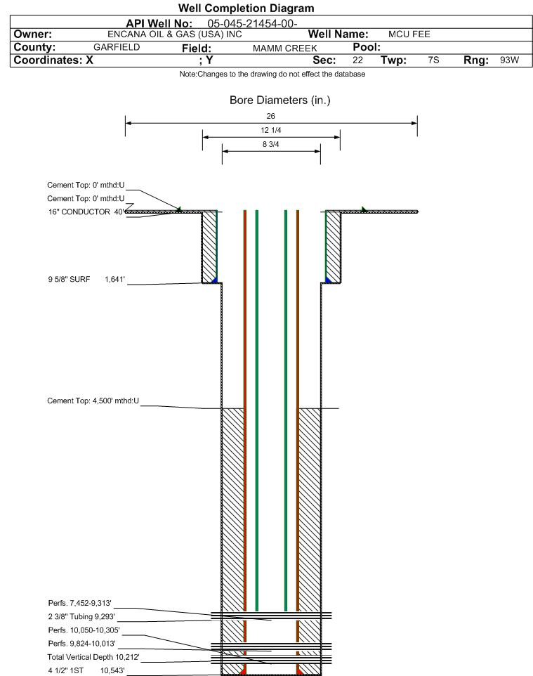 | | Perforation Data: | | Interval Top: | 10050 ft. | # Of Holes: | 27 | | Interval Bottom: | 10305 ft. | Hole Size: | 0.38 in. |