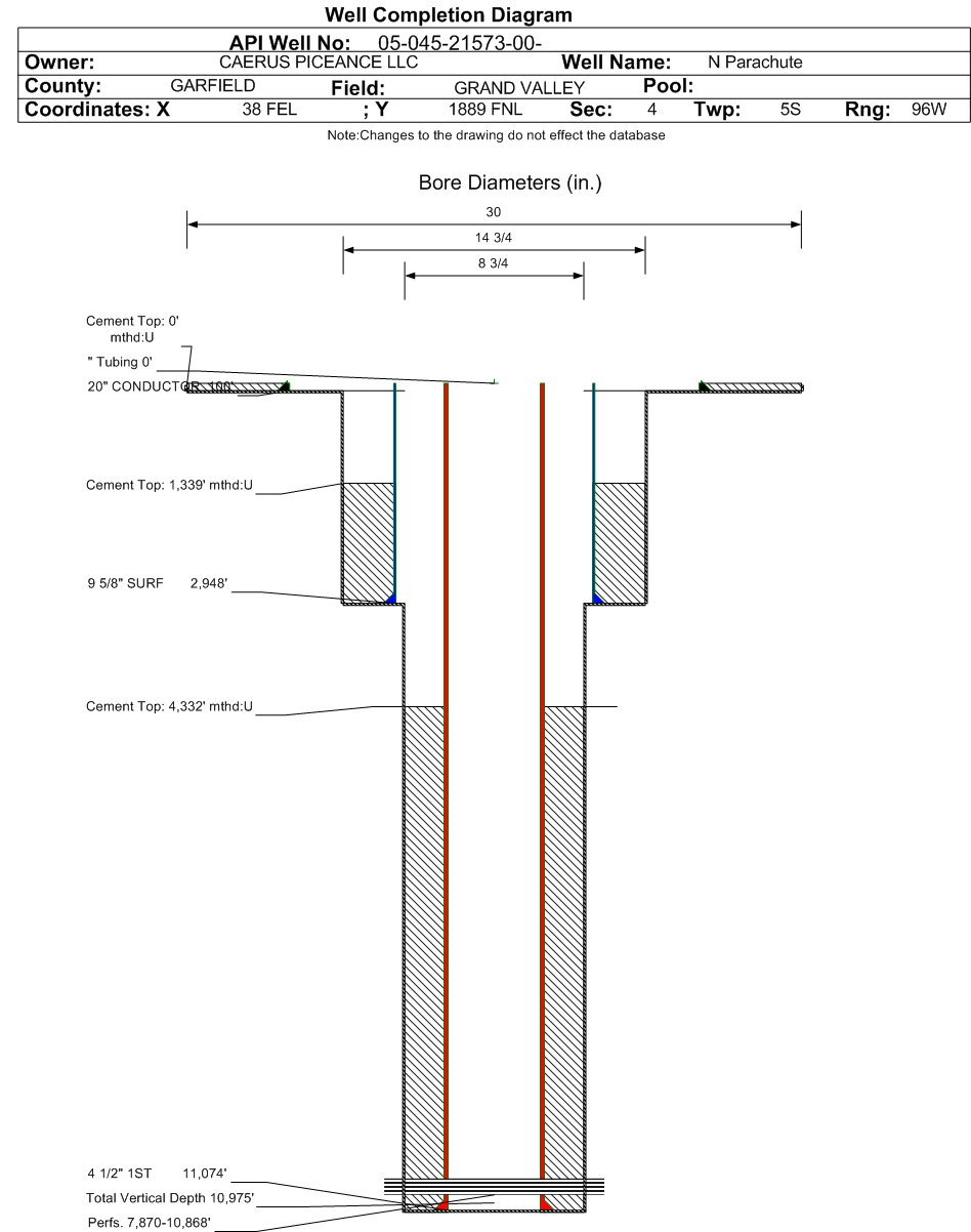 | Wellbore Completed | | Completion Date: | 6/15/2018 | | Spud Date: | 6/9/2018 | Spud Date Is: | ACTUAL | | Measured TD: | 11102 ft. | Measured PB depth: | 11032 ft. | | True Vertical TD: | 10975 ft. | True Vertical PB depth: | 10905 ft. | | Top PZ Location: | Sec:4 Twp: 5S 96W | Footage: 1284 FNL 1175 FEL | | Bottom Hole Location: | Sec:4 Twp: 5S 96W | Footage: 1365 FNL 1336 FEL | | Log Types: | CBL, Pulsed Neutron, (Triple Combo on 045-14545). | | Casing: | String Type: CONDUCTOR, Hole Size: 30 in., Size: 20 in., Top: 0 ft., Depth: 100 ft., Weight: 54 , Citings Type: ACTUAL | | Cement: | Sacks: 218, Top: 0 ft., Bottom: 100 ft., Determination Method: VISU | | Casing: | String Type: SURF, Hole Size: 14.75 in., Size: 9.625 in., Top: 0 ft., Depth: 2948 ft., Weight: 36 , Citings Type: ACTUAL | | Cement: | Sacks: 1031, Top: 1339 ft., Bottom: 2948 ft., Determination Method: CALC | | Casing: | String Type: 1ST, Hole Size: 8.75 in., Size: 4.5 in., Top: 0 ft., Depth: 11074 ft., Weight: 11.6 , Citings Type: ACTUAL | | Cement: | Sacks: 1187, Top: 4332 ft., Bottom: 11102 ft., Determination Method: CBL | | Additional Cement: | String Type: SURF , Top: 0 ft., Depth: 1339 ft., Bottom: 1339 ft., Sacks: 471, Method: 1 INCH | | Formation | Interval Top | Log Bottom | Cored | DSTs | | GREEN RIVER | 0 ft. | | N | N | | WASATCH | 3400 ft. | | N | N | | WASATCH G | 5312 ft. | | N | N | | FORT UNION | 5812 ft. | | N | N | | OHIO CREEK | 7509 ft. | | N | N | | WILLIAMS FORK | 7804 ft. | | N | N | | CAMEO | 10130 ft. | | N | N | | ROLLINS | 10928 ft. | | | |