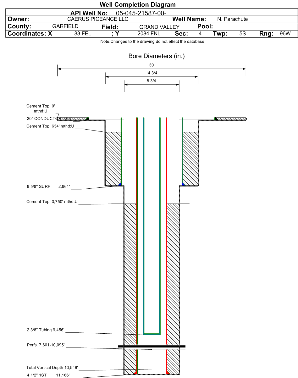 | Wellbore Completed | | Completion Date: | 11/2/2018 | | Spud Date: | 10/26/2018 | Spud Date Is: | ACTUAL | | Measured TD: | 11186 ft. | Measured PB depth: | 11111 ft. | | True Vertical TD: | 10946 ft. | True Vertical PB depth: | 10871 ft. | | Top PZ Location: | Sec:4 Twp: 5S 96W | Footage: 1547 FSL 814 FEL | | Bottom Hole Location: | Sec:4 Twp: 5S 96W | Footage: 1533 FSL 924 FEL | | Log Types: | CBL, Pulsed Neutron, (Triple Combo on 045-14545). | | Casing: | String Type: CONDUCTOR, Hole Size: 30 in., Size: 20 in., Top: 0 ft., Depth: 100 ft., Weight: 54 , Citings Type: ACTUAL | | Cement: | Sacks: 218, Top: 0 ft., Bottom: 100 ft., Determination Method: VISU | | Casing: | String Type: SURF, Hole Size: 14.75 in., Size: 9.625 in., Top: 0 ft., Depth: 2961 ft., Weight: 36 , Citings Type: ACTUAL | | Cement: | Sacks: 1031, Top: 634 ft., Bottom: 2961 ft., Determination Method: CALC | | Casing: | String Type: 1ST, Hole Size: 8.75 in., Size: 4.5 in., Top: 0 ft., Depth: 11166 ft., Weight: 11.6 , Citings Type: ACTUAL | | Cement: | Sacks: 1192, Top: 3750 ft., Bottom: 11186 ft., Determination Method: CBL | | Additional Cement: | String Type: SURF , Top: 0 ft., Depth: 634 ft., Bottom: 634 ft., Sacks: 223, Method: 1 INCH | | Formation | Interval Top | Log Bottom | Cored | DSTs | | GREEN RIVER | 0 ft. | | N | N | | WASATCH | 3416 ft. | | N | N | | WASATCH G | 5190 ft. | | N | N | | FORT UNION | 5617 ft. | | N | N | | OHIO CREEK | 7585 ft. | | N | N | | WILLIAMS FORK | 7894 ft. | | N | N | | CAMEO | 10400 ft. | | N | N | | ROLLINS | 11047 ft. | | | |