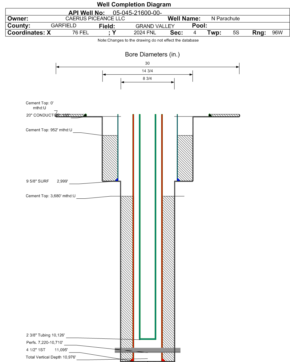 | Wellbore Completed | | Completion Date: | 8/8/2018 | | Spud Date: | 8/1/2018 | Spud Date Is: | ACTUAL | | Measured TD: | 11110 ft. | Measured PB depth: | 11043 ft. | | True Vertical TD: | 10976 ft. | True Vertical PB depth: | 10909 ft. | | Top PZ Location: | Sec:4 Twp: 5S 96W | Footage: 2187 FNL 1356 FEL | | Bottom Hole Location: | Sec:4 Twp: 5S 96W | Footage: 2235 FNL 1550 FEL | | Log Types: | CBL, Pulsed Neutron, (Triple Combo on 045-14545). | | Casing: | String Type: CONDUCTOR, Hole Size: 30 in., Size: 20 in., Top: 0 ft., Depth: 100 ft., Weight: 54 , Citings Type: ACTUAL | | Cement: | Sacks: 218, Top: 0 ft., Bottom: 100 ft., Determination Method: VISU | | Casing: | String Type: SURF, Hole Size: 14.75 in., Size: 9.625 in., Top: 0 ft., Depth: 2999 ft., Weight: 36 , Citings Type: ACTUAL | | Cement: | Sacks: 1031, Top: 952 ft., Bottom: 2999 ft., Determination Method: CALC | | Casing: | String Type: 1ST, Hole Size: 8.75 in., Size: 4.5 in., Top: 0 ft., Depth: 11095 ft., Weight: 11.6 , Citings Type: ACTUAL | | Cement: | Sacks: 1177, Top: 3680 ft., Bottom: 11110 ft., Determination Method: CBL | | Additional Cement: | String Type: SURF , Top: 0 ft., Depth: 952 ft., Bottom: 952 ft., Sacks: 335, Method: 1 INCH | | Formation | Interval Top | Log Bottom | Cored | DSTs | | GREEN RIVER | 0 ft. | | N | N | | WASATCH | 3400 ft. | | N | N | | WASATCH G | 5161 ft. | | N | N | | FORT UNION | 5511 ft. | | N | N | | OHIO CREEK | 7212 ft. | | N | N | | WILLIAMS FORK | 7765 ft. | | N | N | | CAMEO | 10279 ft. | | N | N | | ROLLINS | 10931 ft. | | N | N |
