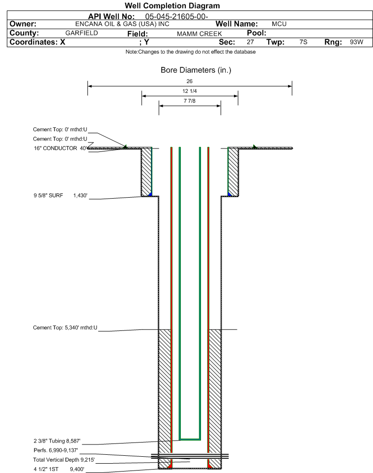 Wellbore #00 Wellbore Classification: GW Status: PR - 7/31/2013 Measured TD: 9430 ft. Vertical TD: 9215 ft.| Wellbore Data for Original Wellbore | Wellbore Classification: GW PR - 7/31/2013 | | Wellbore Permit | DIRECTIONAL | | Permit #: | | Expiration Date: | 6/28/2014 | | Proposed Top PZ Location: | Sec:26 Twp: 7S 93W | Footage: 1426 FSL 1053 FWL | | Bottom Hole Location: | Sec:26 Twp: 7S 93W | Footage: 1415 FSL 1095 FWL | | Proposed Depth/Form: | 9514 ft. | | Surface Mineral Owner Same: | Yes | | Mineral Owner: | FEDERAL | Surface Owner: | FEDERAL | | Unit: | Middleton Creek | Unit Number: | COC-68997X | | Formation And Spacing: | Code: WMFK , Formation: WILLIAMS FORK , Order: , Unit Acreage: , Drill Unit: | | Casing: | String Type: CONDUCTOR, Hole Size: 24 in., Size: 20 in., Top: 0 ft., Depth: 40 ft., Weight: Linepipe , Citings Type: PLANNED | | Cement: | Sacks: 5, Top: 0 ft., Bottom: 40 ft. | | Casing: | String Type: SURF, Hole Size: 12.25 in., Size: 9.625 in., Top: 0 ft., Depth: 1427 ft., Weight: 36 , Citings Type: PLANNED | | Cement: | Sacks: 441, Top: 0 ft., Bottom: 1427 ft. | | Casing: | String Type: 1ST, Hole Size: 7.875 in., Size: 4.5 in., Top: 0 ft., Depth: 9514 ft., Weight: 11.6 , Citings Type: PLANNED | | Cement: | Sacks: 723, Top: 5681 ft., Bottom: 9514 ft. |