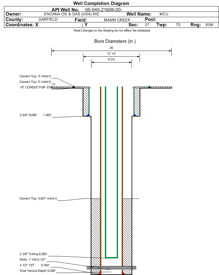 | Wellbore Completed | | Completion Date: | 12/2/2012 | | Spud Date: | 10/3/2012 | Spud Date Is: | ACTUAL | | Measured TD: | 9415 ft. | Measured PB depth: | 9322 ft. | | True Vertical TD: | 9266 ft. | True Vertical PB depth: | 9173 ft. | | Top PZ Location: | Sec:26 Twp: 7S 93W | Footage: 1835 FSL 900 FWL | | Bottom Hole Location: | Sec:26 Twp: 7S 196 | Footage: 1814 FSL 908 FWL | | Log Types: | RST & CBL Logs, Mud logs, Temperature Logs | | Casing: | String Type: CONDUCTOR, Hole Size: 26 in., Size: 16 in., Top: 0 ft., Depth: 63 ft., Weight: 42.0 , Citings Type: ACTUAL | | Cement: | Sacks: 20, Top: 0 ft., Bottom: 63 ft., Determination Method: CALC | | Casing: | String Type: SURF, Hole Size: 12.25 in., Size: 9.625 in., Top: 0 ft., Depth: 1465 ft., Weight: 36.0 , Citings Type: ACTUAL | | Cement: | Sacks: 462, Top: 0 ft., Bottom: 1465 ft., Determination Method: VISU | | Casing: | String Type: 1ST, Hole Size: 8.75 in., Size: 4.5 in., Top: 0 ft., Depth: 9392 ft., Weight: 11.60 , Citings Type: ACTUAL | | Cement: | Sacks: 804, Top: 5601 ft., Bottom: 9392 ft., Determination Method: CBL | | Formation | Interval Top | Log Bottom | Cored | DSTs | | WILLIAMS FORK | 6469 ft. | 9249 ft. | | | | ROLLINS | 9249 ft. | 9415 ft. | | |