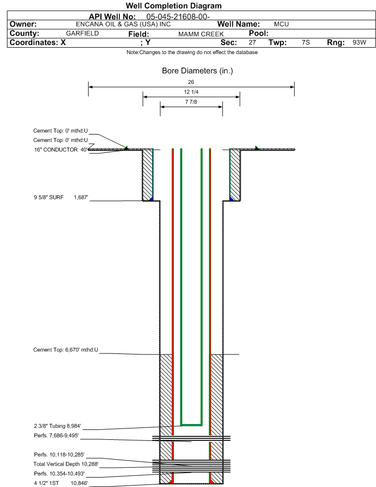 | | Perforation Data: | | Interval Top: | 10354 ft. | # Of Holes: | 3 | | Interval Bottom: | 10493 ft. | Hole Size: | 0.38 in. |