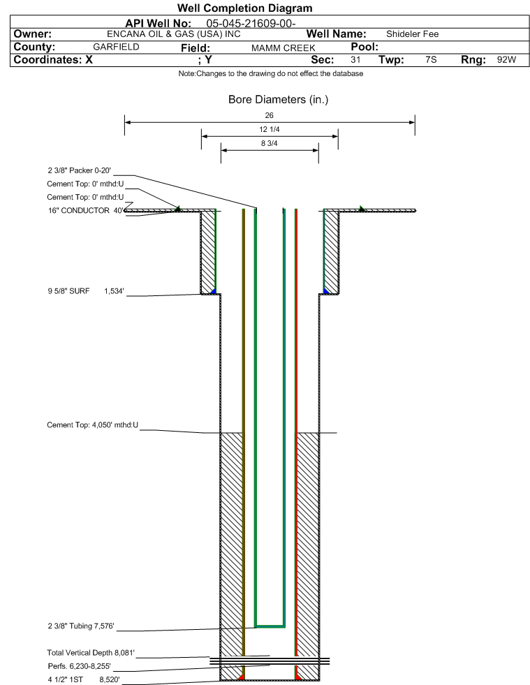 | | Perforation Data: | | Interval Top: | 6230 ft. | # Of Holes: | 189 | | Interval Bottom: | 8255 ft. | Hole Size: | 0.38 in. |