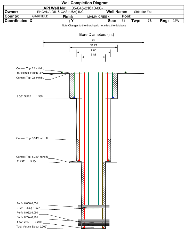| Wellbore Completed | | Completion Date: | 11/16/2012 | | Spud Date: | 8/25/2012 | Spud Date Is: | ACTUAL | | Measured TD: | 9258 ft. | Measured PB depth: | 9170 ft. | | True Vertical TD: | 9202 ft. | True Vertical PB depth: | 9114 ft. | | Top PZ Location: | Sec:31 Twp: 7S 92W | Footage: 2669 FNL 1921 FEL | | Bottom Hole Location: | Sec:31 Twp: 7S 92W | Footage: 2680 FNL 1964 FEL | | Log Types: | RST, CBL (included on Neutron Log) PEX and Mud. | | Casing: | String Type: CONDUCTOR, Hole Size: 26 in., Size: 16 in., Top: 0 ft., Depth: 40 ft., Weight: 42 , Citings Type: ACTUAL | | Cement: | Sacks: 40, Top: 22 ft., Bottom: 40 ft., Determination Method: CALC | | Casing: | String Type: SURF, Hole Size: 12.25 in., Size: 9.625 in., Top: 0 ft., Depth: 1530 ft., Weight: 36 , Citings Type: ACTUAL | | Cement: | Sacks: 480, Top: 22 ft., Bottom: 1530 ft., Determination Method: CALC | | Casing: | String Type: 1ST, Hole Size: 8.75 in., Size: 7 in., Top: 0 ft., Depth: 5254 ft., Weight: 23 , Citings Type: ACTUAL | | Cement: | Sacks: 194, Top: 3943 ft., Bottom: 5254 ft., Determination Method: CALC | | Casing: | String Type: 2ND, Hole Size: 6.125 in., Size: 4.5 in., Top: 0 ft., Depth: 9258 ft., Weight: 11.60 , Citings Type: ACTUAL | | Cement: | Sacks: 332, Top: 5350 ft., Bottom: 9258 ft., Determination Method: CBL | | Formation | Interval Top | Log Bottom | Cored | DSTs | | MESAVERDE | 4591 ft. | 5302 ft. | N | N | | WILLIAMS FORK | 5303 ft. | 8128 ft. | N | N | | ROLLINS | 8129 ft. | 8696 ft. | N | N | | COZZETTE | 8697 ft. | 8922 ft. | N | N | | CORCORAN | 8923 ft. | 9258 ft. | | |