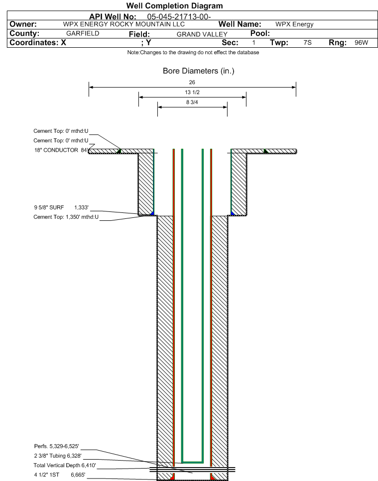 Wellbore #00 Wellbore Classification: GW Status: PR - 3/15/2013 Measured TD: 6683 ft. Vertical TD: 6410 ft.| Wellbore Data for Original Wellbore | Wellbore Classification: GW PR - 3/15/2013 | | Wellbore Permit | DIRECTIONAL | | Permit #: | | Expiration Date: | 9/20/2014 | | Proposed Top PZ Location: | Sec:12 Twp: 7S 96W | Footage: 547 FNL 1490 FEL | | Bottom Hole Location: | Sec:12 Twp: 7S 96W | Footage: 547 FNL 1490 FEL | | Proposed Depth/Form: | 6675 ft. | | Surface Mineral Owner Same: | No | | Mineral Owner: | FEE | Surface Owner: | FEE | | Unit: | | Unit Number: | | | Formation And Spacing: | Code: WFILS , Formation: WILLIAMS FORK-ILES , Order: 479-22 , Unit Acreage: 320, Drill Unit: E/2 | | Casing: | String Type: CONDUCTOR, Hole Size: 26 in., Size: 18 in., Top: 0 ft., Depth: 60 ft., Weight: 48# , Citings Type: PLANNED | | Cement: | Sacks: 25, Top: 0 ft., Bottom: 60 ft. | | Casing: | String Type: SURF, Hole Size: 13.5 in., Size: 9.625 in., Top: 0 ft., Depth: 1305 ft., Weight: 32.3# , Citings Type: PLANNED | | Cement: | Sacks: 341, Top: 0 ft., Bottom: 1305 ft. | | Casing: | String Type: 1ST, Hole Size: 8.75 in., Size: 4.5 in., Top: 0 ft., Depth: 6675 ft., Weight: 11.6# , Citings Type: PLANNED | | Cement: | Sacks: 782, Top: , Bottom: 6675 ft. |
