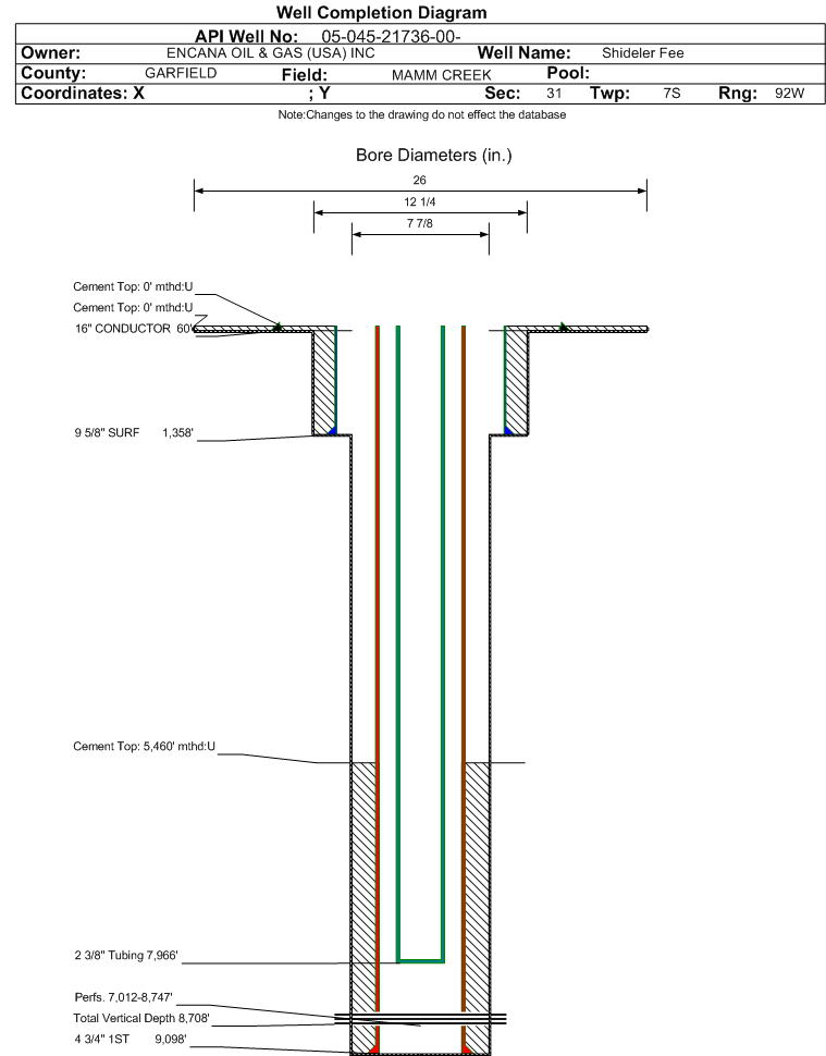 | Wellbore Completed | | Completion Date: | 12/10/2012 | | Spud Date: | 12/2/2012 | Spud Date Is: | ACTUAL | | Measured TD: | 9118 ft. | Measured PB depth: | 9049 ft. | | True Vertical TD: | 8708 ft. | True Vertical PB depth: | 8640 ft. | | Top PZ Location: | Sec:31 Twp: 7S 92W | Footage: 527 FSL 52 FWL | | Bottom Hole Location: | Sec:31 Twp: 7S 92W | Footage: 533 FSL 48 FWL | | Log Types: | CBL, mudlog, RST | | Casing: | String Type: CONDUCTOR, Hole Size: 26 in., Size: 16 in., Top: 0 ft., Depth: 60 ft., Weight: , Citings Type: ACTUAL | | Cement: | Sacks: 114, Top: 0 ft., Bottom: 60 ft., Determination Method: CALC | | Casing: | String Type: SURF, Hole Size: 12.25 in., Size: 9.625 in., Top: 0 ft., Depth: 1358 ft., Weight: , Citings Type: ACTUAL | | Cement: | Sacks: 435, Top: 0 ft., Bottom: 1358 ft., Determination Method: CALC | | Casing: | String Type: 1ST, Hole Size: 7.875 in., Size: 4.75 in., Top: 0 ft., Depth: 9098 ft., Weight: , Citings Type: ACTUAL | | Cement: | Sacks: 890, Top: 5460 ft., Bottom: 9118 ft., Determination Method: CBL | | Formation | Interval Top | Log Bottom | Cored | DSTs | | WILLIAMS FORK | 5956 ft. | 8924 ft. | | |