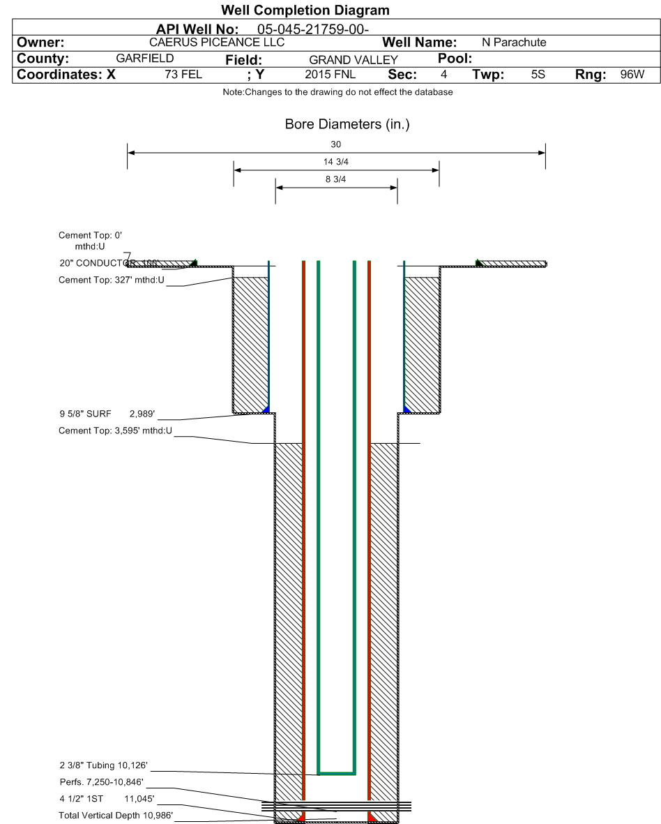 | Wellbore Completed | | Completion Date: | 7/18/2018 | | Spud Date: | 7/11/2018 | Spud Date Is: | ACTUAL | | Measured TD: | 11083 ft. | Measured PB depth: | 10953 ft. | | True Vertical TD: | 10986 ft. | True Vertical PB depth: | 10856 ft. | | Top PZ Location: | Sec:4 Twp: 5S 96W | Footage: 1886 FNL 1148 FEL | | Bottom Hole Location: | Sec:4 Twp: 5S 96W | Footage: 2014 FNL 1287 FEL | | Log Types: | CBL, Pulsed Neutron, (Triple Combo on 045-14545). | | Casing: | String Type: CONDUCTOR, Hole Size: 30 in., Size: 20 in., Top: 0 ft., Depth: 100 ft., Weight: 54 , Citings Type: ACTUAL | | Cement: | Sacks: 218, Top: 0 ft., Bottom: 100 ft., Determination Method: VISU | | Casing: | String Type: SURF, Hole Size: 14.75 in., Size: 9.625 in., Top: 0 ft., Depth: 2989 ft., Weight: 36 , Citings Type: ACTUAL | | Cement: | Sacks: 1031, Top: 327 ft., Bottom: 2989 ft., Determination Method: CALC | | Casing: | String Type: 1ST, Hole Size: 8.75 in., Size: 4.5 in., Top: 0 ft., Depth: 11045 ft., Weight: 11.6 , Citings Type: ACTUAL | | Cement: | Sacks: 1179, Top: 3595 ft., Bottom: 11083 ft., Determination Method: CBL | | Additional Cement: | String Type: SURF , Top: 0 ft., Depth: 327 ft., Bottom: 327 ft., Sacks: 115, Method: 1 INCH | | Formation | Interval Top | Log Bottom | Cored | DSTs | | GREEN RIVER | 0 ft. | | N | N | | WASATCH | 3400 ft. | | N | N | | WASATCH G | 5179 ft. | | N | N | | FORT UNION | 5529 ft. | | N | N | | OHIO CREEK | 7216 ft. | | N | N | | WILLIAMS FORK | 7750 ft. | | N | N | | CAMEO | 10250 ft. | | N | N | | ROLLINS | 10920 ft. | | N | N |