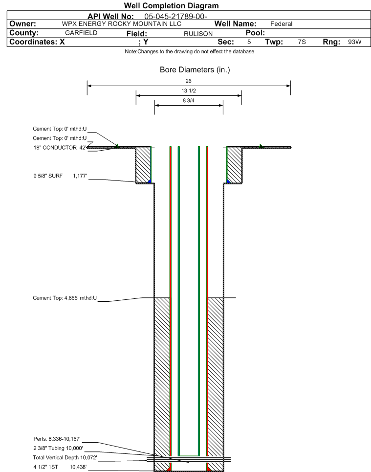 Wellbore #00 Wellbore Classification: GW Status: PR - 12/5/2014 Measured TD: 10445 ft. Vertical TD: 10072 ft.| Wellbore Data for Original Wellbore | Wellbore Classification: GW PR - 12/5/2014 | | Wellbore Permit | DIRECTIONAL | | Permit #: | | Expiration Date: | 11/25/2014 | | Proposed Top PZ Location: | Sec:32 Twp: 6S 93W | Footage: 2045 FSL 1944 FWL | | Bottom Hole Location: | Sec:32 Twp: 6S 93W | Footage: 2045 FSL 1944 FWL | | Proposed Depth/Form: | 10481 ft. | | Surface Mineral Owner Same: | Yes | | Mineral Owner: | FEDERAL | Surface Owner: | FEDERAL | | Unit: | | Unit Number: | | | Formation And Spacing: | Code: WMFK , Formation: WILLIAMS FORK , Order: 139-47 , Unit Acreage: 640, Drill Unit: All | | Casing: | String Type: CONDUCTOR, Hole Size: 26 in., Size: 18 in., Top: 0 ft., Depth: 60 ft., Weight: 48# , Citings Type: PLANNED | | Cement: | Sacks: 25, Top: 0 ft., Bottom: 60 ft. | | Casing: | String Type: SURF, Hole Size: 13.5 in., Size: 9.625 in., Top: 0 ft., Depth: 1141 ft., Weight: 32.3# , Citings Type: PLANNED | | Cement: | Sacks: 301, Top: 0 ft., Bottom: 1141 ft. | | Casing: | String Type: 1ST, Hole Size: 8.75 in., Size: 4.5 in., Top: 0 ft., Depth: 10481 ft., Weight: 11.6# , Citings Type: PLANNED | | Cement: | Sacks: 992, Top: , Bottom: 10481 ft. |