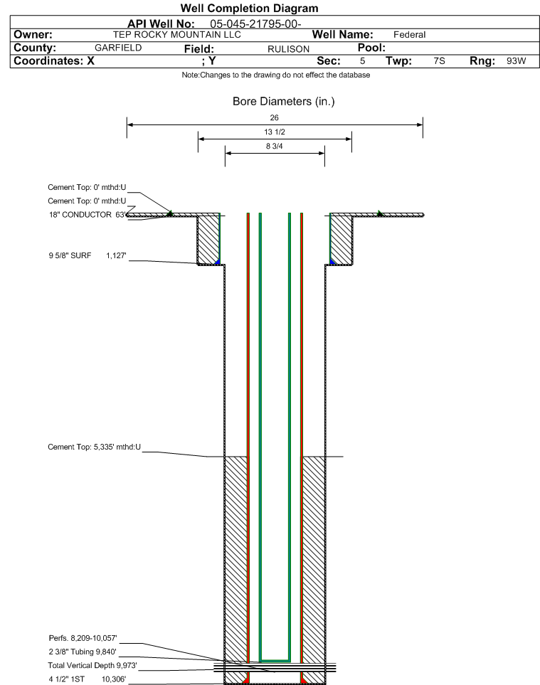 Wellbore #00 Wellbore Classification: GW Status: PR - 1/19/2014 Measured TD: 10316 ft. Vertical TD: 9973 ft.| Wellbore Data for Original Wellbore | Wellbore Classification: GW PR - 1/19/2014 | | Wellbore Permit | DIRECTIONAL | | Permit #: | | Expiration Date: | 11/25/2014 | | Proposed Top PZ Location: | Sec:5 Twp: 7S 93W | Footage: 873 FNL 664 FEL | | Bottom Hole Location: | Sec:5 Twp: 7S 93W | Footage: 873 FNL 664 FEL | | Proposed Depth/Form: | 10327 ft. | | Surface Mineral Owner Same: | Yes | | Mineral Owner: | FEDERAL | Surface Owner: | FEDERAL | | Unit: | | Unit Number: | | | Formation And Spacing: | Code: WMFK , Formation: WILLIAMS FORK , Order: 139-76 , Unit Acreage: , Drill Unit: | | Casing: | String Type: CONDUCTOR, Hole Size: 26 in., Size: 18 in., Top: 0 ft., Depth: 60 ft., Weight: 48# , Citings Type: PLANNED | | Cement: | Sacks: 25, Top: 0 ft., Bottom: 60 ft. | | Casing: | String Type: SURF, Hole Size: 13.5 in., Size: 9.625 in., Top: 0 ft., Depth: 1136 ft., Weight: 32.3# , Citings Type: PLANNED | | Cement: | Sacks: 299, Top: 0 ft., Bottom: 1136 ft. | | Casing: | String Type: 1ST, Hole Size: 8.75 in., Size: 4.5 in., Top: 0 ft., Depth: 10327 ft., Weight: 11.6# , Citings Type: PLANNED | | Cement: | Sacks: 978, Top: , Bottom: 10327 ft. |