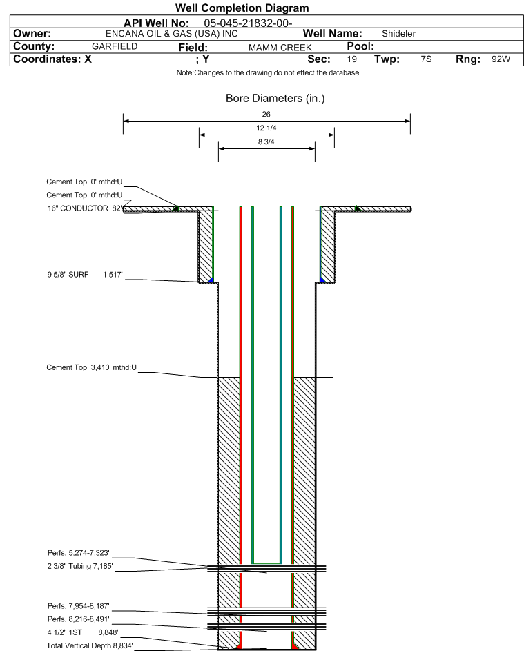 | | Perforation Data: | | Interval Top: | 7954 ft. | # Of Holes: | 27 | | Interval Bottom: | 8187 ft. | Hole Size: | 0.38 in. |
