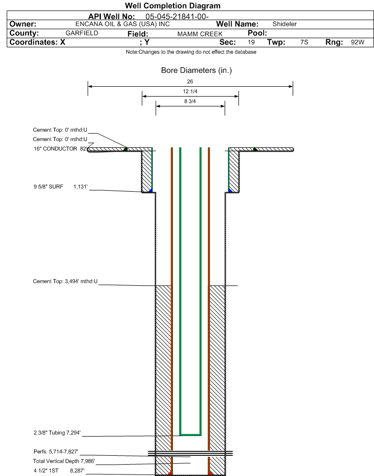 | Wellbore Completed | | Completion Date: | 2/20/2013 | | Spud Date: | 1/28/2013 | Spud Date Is: | ACTUAL | | Measured TD: | 8340 ft. | Measured PB depth: | 8237 ft. | | True Vertical TD: | 7986 ft. | True Vertical PB depth: | 7883 ft. | | Top PZ Location: | Sec:30 Twp: 7S 92w | Footage: 572 FNL 1095 FWL | | Bottom Hole Location: | Sec:30 Twp: 7S 92W | Footage: 579 FNL 1070 FWL | | Log Types: | RST, CBL, Temperature, and Mud logs | | Casing: | String Type: CONDUCTOR, Hole Size: 26 in., Size: 16 in., Top: 0 ft., Depth: 82 ft., Weight: 42.09 , Citings Type: ACTUAL | | Cement: | Sacks: 0, Top: 0 ft., Bottom: 82 ft., Determination Method: VISU | | Casing: | String Type: SURF, Hole Size: 12.25 in., Size: 9.625 in., Top: 0 ft., Depth: 1131 ft., Weight: 36.0 , Citings Type: ACTUAL | | Cement: | Sacks: 426, Top: 0 ft., Bottom: 1131 ft., Determination Method: VISU | | Casing: | String Type: 1ST, Hole Size: 8.75 in., Size: 4.5 in., Top: 0 ft., Depth: 8287 ft., Weight: 11.60 , Citings Type: ACTUAL | | Cement: | Sacks: 861, Top: 3494 ft., Bottom: 8287 ft., Determination Method: CBL | | Formation | Interval Top | Log Bottom | Cored | DSTs | | MESAVERDE | 4196 ft. | 4782 ft. | | | | WILLIAMS FORK | 4782 ft. | 7849 ft. | | | | ROLLINS | 7849 ft. | 8340 ft. | | |