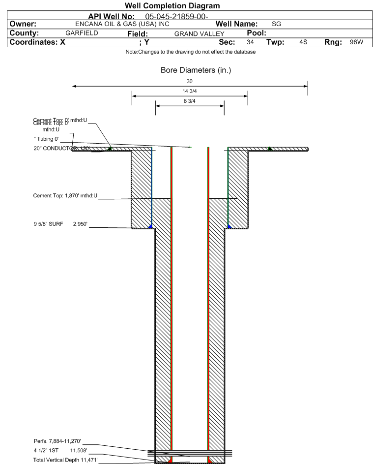 | Wellbore Completed | | Completion Date: | 12/9/2013 | | Spud Date: | 9/23/2013 | Spud Date Is: | ACTUAL | | Measured TD: | 11530 ft. | Measured PB depth: | 11482 ft. | | True Vertical TD: | 11471 ft. | True Vertical PB depth: | 11423 ft. | | Top PZ Location: | Sec:34 Twp: 4S 96W | Footage: 1363 FNL 1354 FWL | | Bottom Hole Location: | Sec:34 Twp: 4S 96W | Footage: 1350 FNL 1345 FWL | | Log Types: | CBL, Mud logs | | Casing: | String Type: CONDUCTOR, Hole Size: 30 in., Size: 20 in., Top: 0 ft., Depth: 120 ft., Weight: 52.78 , Citings Type: ACTUAL | | Cement: | Sacks: 125, Top: 0 ft., Bottom: 120 ft., Determination Method: VISU | | Casing: | String Type: SURF, Hole Size: 14.75 in., Size: 9.625 in., Top: 0 ft., Depth: 2950 ft., Weight: 36.0 , Citings Type: ACTUAL | | Cement: | Sacks: 1146, Top: 0 ft., Bottom: 2950 ft., Determination Method: VISU | | Casing: | String Type: 1ST, Hole Size: 8.75 in., Size: 4.5 in., Top: 0 ft., Depth: 11508 ft., Weight: 11.6 , Citings Type: ACTUAL | | Cement: | Sacks: 2351, Top: 1870 ft., Bottom: 11508 ft., Determination Method: CBL | | Formation | Interval Top | Log Bottom | Cored | DSTs | | WILLIAMS FORK | 7817 ft. | 11421 ft. | | | | ROLLINS | 11422 ft. | 11530 ft. | | |