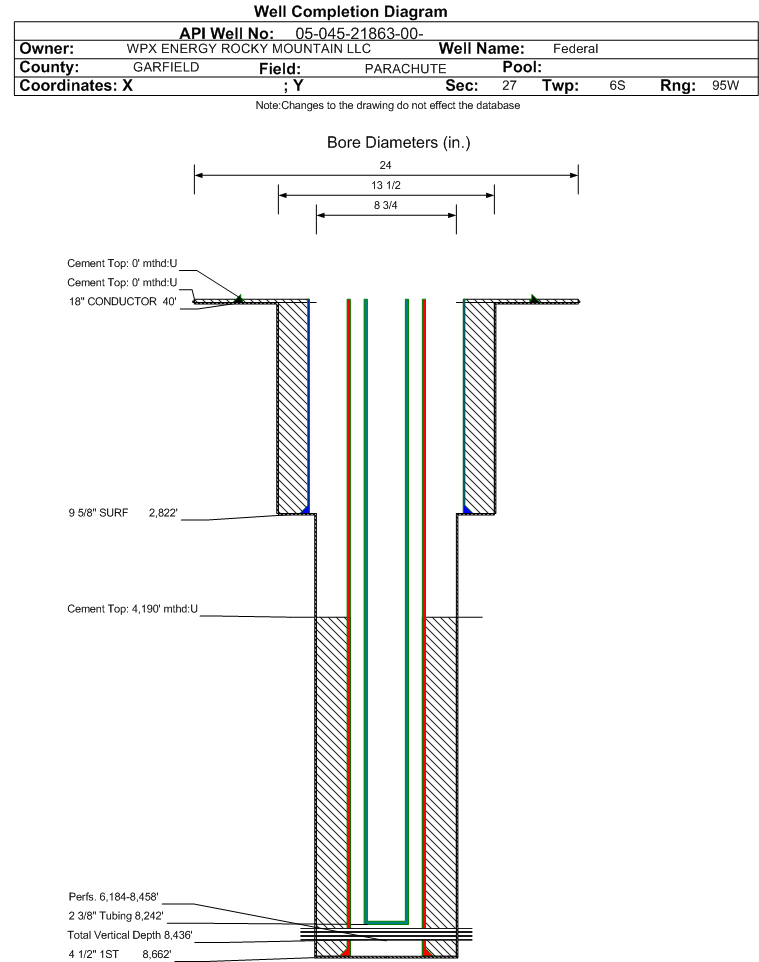 Wellbore #00 Wellbore Classification: GW Status: PR - 12/9/2013 Measured TD: 8682 ft. Vertical TD: 8436 ft.| Wellbore Data for Original Wellbore | Wellbore Classification: GW PR - 12/9/2013 | | Wellbore Permit | DIRECTIONAL | | Permit #: | | Expiration Date: | 2/7/2015 | | Proposed Top PZ Location: | Sec:27 Twp: 6S 95W | Footage: 542 FNL 774 FWL | | Bottom Hole Location: | Sec:27 Twp: 6S 95W | Footage: 542 FNL 774 FWL | | Proposed Depth/Form: | 8614 ft. | | Surface Mineral Owner Same: | Yes | | Mineral Owner: | FEDERAL | Surface Owner: | FEDERAL | | Unit: | | Unit Number: | | | Formation And Spacing: | Code: WMFK , Formation: WILLIAMS FORK , Order: , Unit Acreage: , Drill Unit: | | Casing: | String Type: CONDUCTOR, Hole Size: 24 in., Size: 18 in., Top: 0 ft., Depth: 45 ft., Weight: 48 , Citings Type: PLANNED | | Cement: | Sacks: 50, Top: 0 ft., Bottom: 45 ft. | | Casing: | String Type: SURF, Hole Size: 13.5 in., Size: 9.625 in., Top: 0 ft., Depth: 3704 ft., Weight: 32.3 , Citings Type: PLANNED | | Cement: | Sacks: 935, Top: 0 ft., Bottom: 3705 ft. | | Casing: | String Type: 1ST, Hole Size: 8.75 in., Size: 4.5 in., Top: 0 ft., Depth: 8614 ft., Weight: 8614 , Citings Type: PLANNED | | Cement: | Sacks: 897, Top: 4773 ft., Bottom: 8614 ft. |