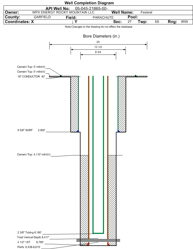 | Wellbore Completed | | Completion Date: | 9/22/2013 | | Spud Date: | 9/12/2013 | Spud Date Is: | ACTUAL | | Measured TD: | 8795 ft. | Measured PB depth: | 8750 ft. | | True Vertical TD: | 8417 ft. | True Vertical PB depth: | 8372 ft. | | Top PZ Location: | Sec:27 Twp: 6S 95W | Footage: 161 FNL 584 FWL | | Bottom Hole Location: | Sec:27 Twp: 6S 95W | Footage: 139 FNL 615 FWL | | Log Types: | CBL, Mud, and Reservoir Performance Monitor (RPM) | | Casing: | String Type: CONDUCTOR, Hole Size: 24 in., Size: 18 in., Top: 0 ft., Depth: 40 ft., Weight: 48 , Citings Type: ACTUAL | | Cement: | Sacks: 23, Top: 0 ft., Bottom: 40 ft., Determination Method: VISU | | Casing: | String Type: SURF, Hole Size: 13.5 in., Size: 9.625 in., Top: 0 ft., Depth: 2902 ft., Weight: 32.3 , Citings Type: ACTUAL | | Cement: | Sacks: 660, Top: 0 ft., Bottom: 2902 ft., Determination Method: VISU | | Casing: | String Type: 1ST, Hole Size: 8.75 in., Size: 4.5 in., Top: 0 ft., Depth: 8785 ft., Weight: 11.6 , Citings Type: ACTUAL | | Cement: | Sacks: 965, Top: 4110 ft., Bottom: 8785 ft., Determination Method: CBL | | Formation | Interval Top | Log Bottom | Cored | DSTs | | WASATCH G | 2771 ft. | | | | | MESAVERDE | 5140 ft. | | | | | CAMEO | 7935 ft. | | | | | ROLLINS | 8686 ft. | | | |