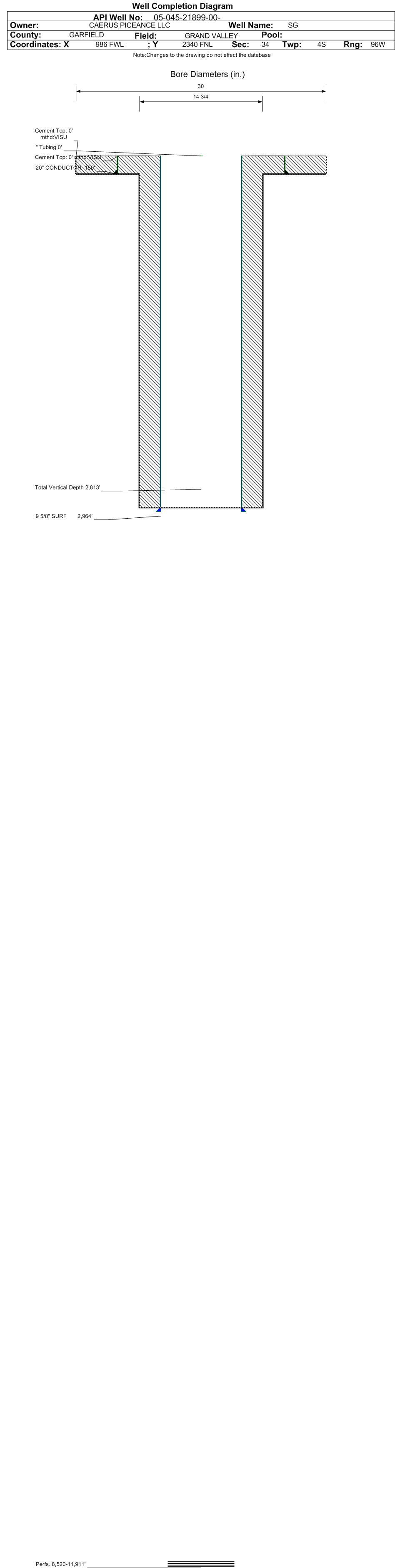 | Wellbore Completed | | Completion Date: | 4/18/2019 | | Spud Date: | 10/21/2013 | Spud Date Is: | ACTUAL | | Measured TD: | 12095 ft. | Measured PB depth: | 12027 ft. | | True Vertical TD: | 11399 ft. | True Vertical PB depth: | 11332 ft. | | Top PZ Location: | Sec:34 Twp: 4S 96W | Footage: 774 FSL 2395 FEL | | Bottom Hole Location: | Sec:34 Twp: 4S 96W | Footage: 711 FSL 2575 FEL | | Log Types: | No logs ran | | Log Types: | CBL, Pulsed Neutron, (Triple Combo on 045-21909). | | Casing: | String Type: CONDUCTOR, Hole Size: 30 in., Size: 20 in., Top: 0 ft., Depth: 150 ft., Weight: 52.8 , Citings Type: ACTUAL | | Cement: | Sacks: 125, Top: 0 ft., Bottom: 150 ft., Determination Method: VISU | | Casing: | String Type: SURF, Hole Size: 14.75 in., Size: 9.625 in., Top: 0 ft., Depth: 2964 ft., Weight: 36 , Citings Type: ACTUAL | | Cement: | Sacks: 1150, Top: 0 ft., Bottom: 2964 ft., Determination Method: VISU | | Casing: | String Type: 1ST, Hole Size: 8.75 in., Size: 4.5 in., Top: 0 ft., Depth: 12075 ft., Weight: 11.6 , Citings Type: ACTUAL | | Cement: | Sacks: 1786, Top: 3350 ft., Bottom: 12095 ft., Determination Method: CBL | | Formation | Interval Top | Log Bottom | Cored | DSTs | | GREEN RIVER | 0 ft. | | N | N | | WASATCH | 3257 ft. | | N | N | | WASATCH G | 5832 ft. | | N | N | | FORT UNION | 6340 ft. | | N | N | | OHIO CREEK | 8453 ft. | | N | N | | WILLIAMS FORK | 8754 ft. | | N | N | | CAMEO | 11344 ft. | | N | N | | ROLLINS | 12026 ft. | | N | N |