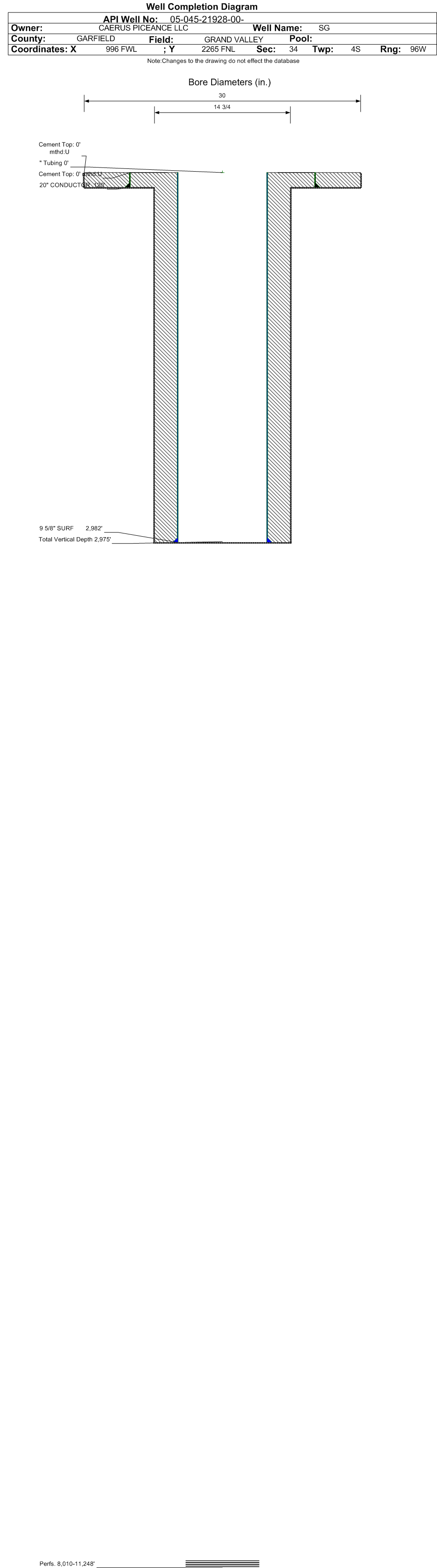 | Wellbore Completed | | Completion Date: | 1/3/2019 | | Spud Date: | 9/5/2013 | Spud Date Is: | ACTUAL | | Measured TD: | 11494 ft. | Measured PB depth: | 11418 ft. | | True Vertical TD: | 11411 ft. | True Vertical PB depth: | 11335 ft. | | Top PZ Location: | Sec:34 Twp: 4S 96W | Footage: 2660 FSL 1800 FWL | | Bottom Hole Location: | Sec:34 Twp: 4S 96W | Footage: 2621 FSL 1653 FWL | | Log Types: | No logs ran | | Log Types: | CBL, Pulsed Neutron, (Triple Combo on 045-21909). | | Casing: | String Type: CONDUCTOR, Hole Size: 30 in., Size: 20 in., Top: 0 ft., Depth: 120 ft., Weight: 52.8 , Citings Type: ACTUAL | | Cement: | Sacks: 125, Top: 0 ft., Bottom: 120 ft., Determination Method: VISU | | Casing: | String Type: SURF, Hole Size: 14.75 in., Size: 9.625 in., Top: 0 ft., Depth: 2982 ft., Weight: 36 , Citings Type: ACTUAL | | Cement: | Sacks: 1144, Top: 0 ft., Bottom: 2982 ft., Determination Method: VISU | | Casing: | String Type: 1ST, Hole Size: 8.75 in., Size: 4.5 in., Top: 0 ft., Depth: 11471 ft., Weight: 11.6 , Citings Type: ACTUAL | | Cement: | Sacks: 988, Top: 9160 ft., Bottom: 11494 ft., Determination Method: CBL | | Formation | Interval Top | Log Bottom | Cored | DSTs | | GREEN RIVER | 0 ft. | | N | N | | WASATCH | 3128 ft. | | N | N | | WASATCH G | 5514 ft. | | N | N | | FORT UNION | 5898 ft. | | N | N | | OHIO CREEK | 7859 ft. | | N | N | | WILLIAMS FORK | 8139 ft. | | N | N | | CAMEO | 10743 ft. | | N | N | | ROLLINS | 11392 ft. | | N | N |