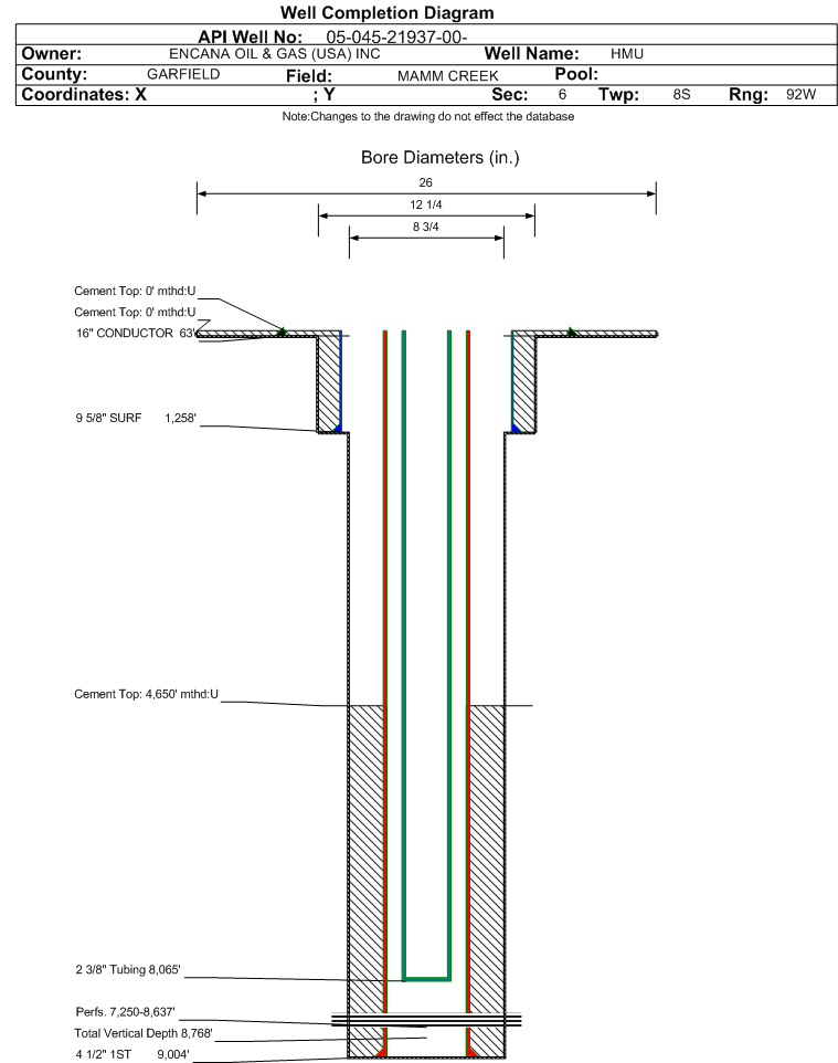 | | Perforation Data: | | Interval Top: | 7250 ft. | # Of Holes: | 162 | | Interval Bottom: | 8637 ft. | Hole Size: | 0.38 in. |