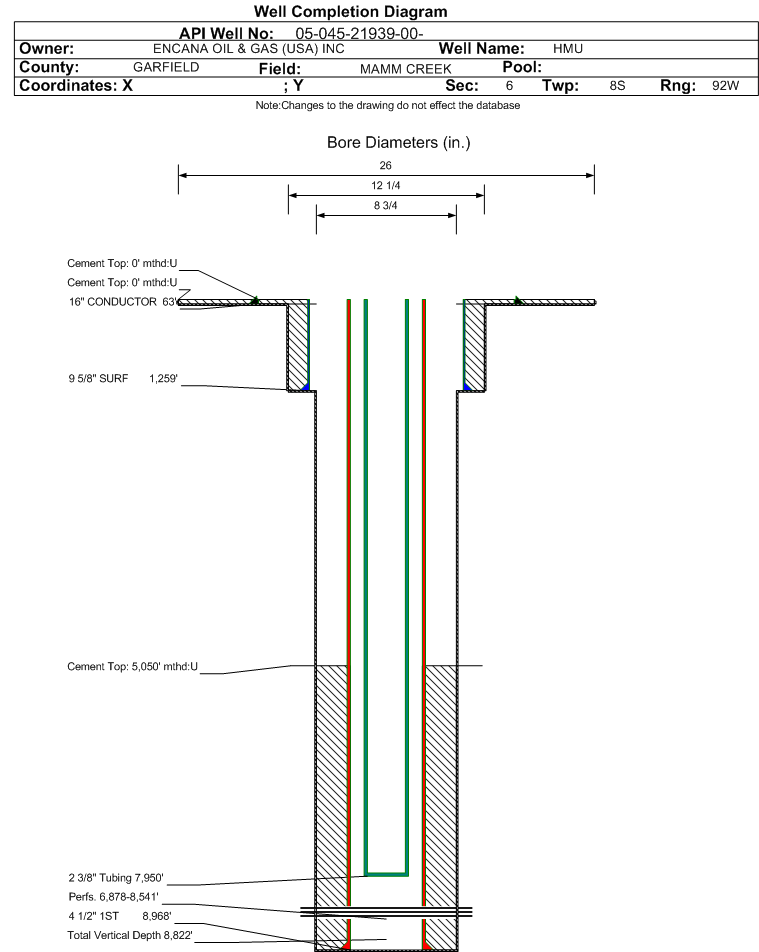 | Wellbore Completed | | Completion Date: | 11/17/2013 | | Spud Date: | 8/15/2013 | Spud Date Is: | ACTUAL | | Measured TD: | 8988 ft. | Measured PB depth: | 8907 ft. | | True Vertical TD: | 8822 ft. | True Vertical PB depth: | 8741 ft. | | Top PZ Location: | Sec:6 Twp: 8S 92W | Footage: 1795 FSL 744 FWL | | Bottom Hole Location: | Sec:6 Twp: 8S 92W | Footage: 1810 FSL 747 FWL | | Log Types: | CBL, RST, Mud, Temperature Logs | | Casing: | String Type: CONDUCTOR, Hole Size: 26 in., Size: 16 in., Top: 0 ft., Depth: 63 ft., Weight: 42.09 , Citings Type: ACTUAL | | Cement: | Sacks: 114, Top: 0 ft., Bottom: 63 ft., Determination Method: VISU | | Casing: | String Type: SURF, Hole Size: 12.25 in., Size: 9.625 in., Top: 0 ft., Depth: 1259 ft., Weight: 36.0 , Citings Type: ACTUAL | | Cement: | Sacks: 400, Top: 0 ft., Bottom: 1259 ft., Determination Method: VISU | | Casing: | String Type: 1ST, Hole Size: 8.75 in., Size: 4.5 in., Top: 0 ft., Depth: 8968 ft., Weight: 11.6 , Citings Type: ACTUAL | | Cement: | Sacks: 984, Top: 5050 ft., Bottom: 8968 ft., Determination Method: CBL | | Formation | Interval Top | Log Bottom | Cored | DSTs | | WILLIAMS FORK | 5331 ft. | 8831 ft. | | | | ROLLINS | 8831 ft. | 8988 ft. | | |